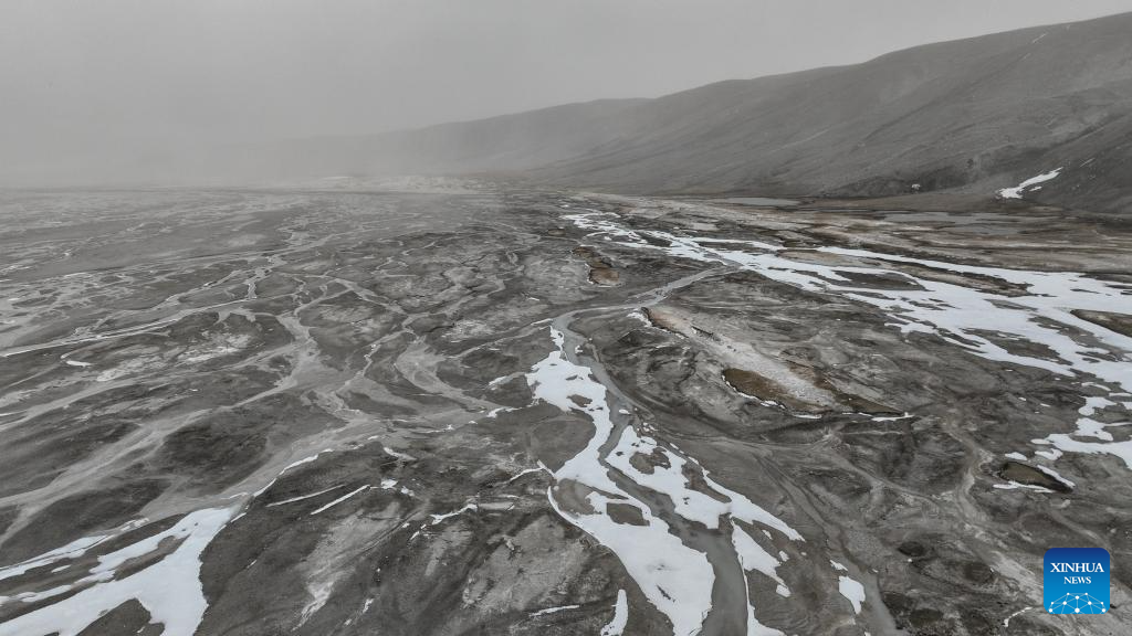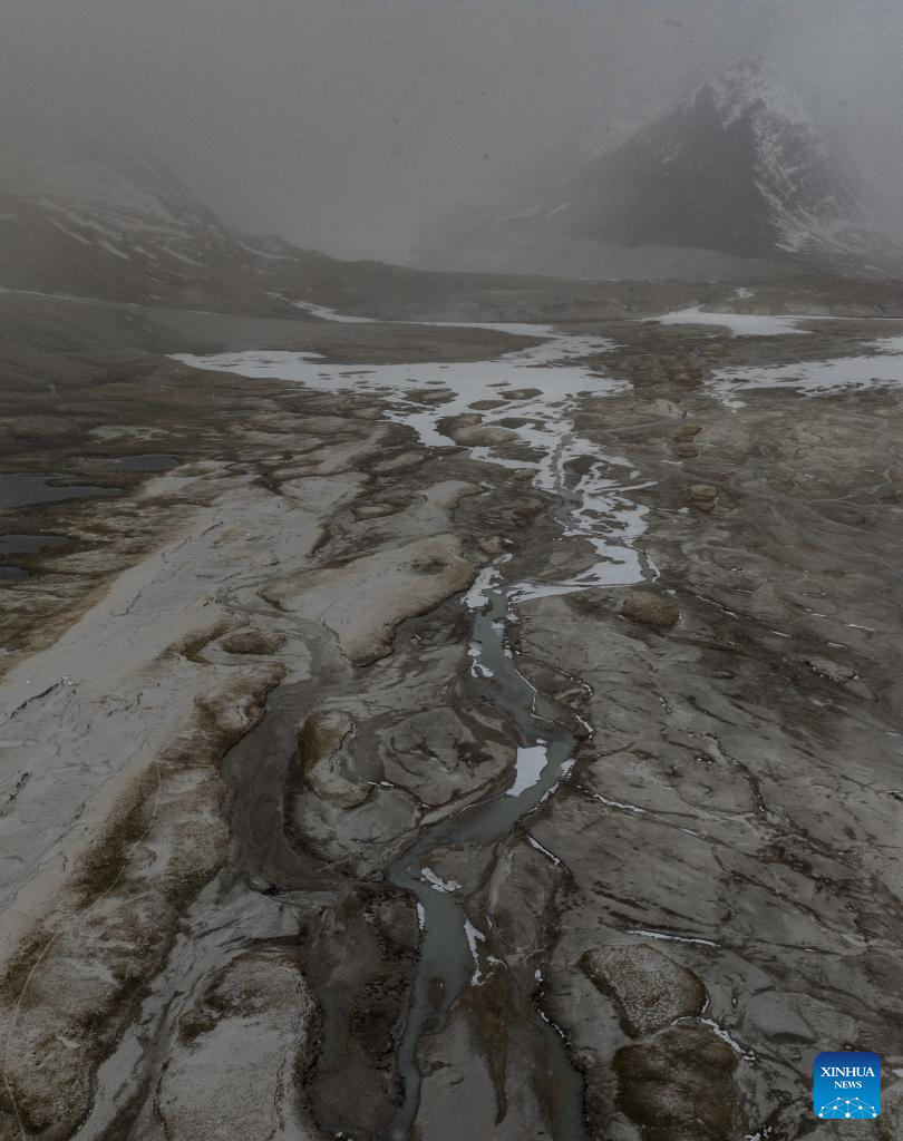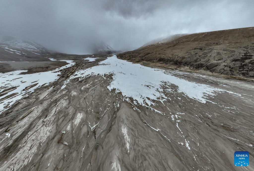 This aerial photo taken on May 31, 2023 shows the river bed at the foot of the Gyaimaryangzhong Glacier in southwest China's Tibet Autonomous Region. The Gyaimaryangzhong Glacier is the source of the Yarlung Zangbo River, China's longest plateau river. (Xinhua/Jigme Dorje)