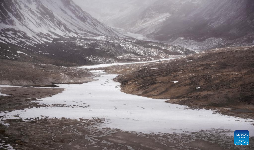 This photo taken on May 31, 2023 shows the river valley at the foot of the Gyaimaryangzhong Glacier in southwest China's Tibet Autonomous Region. The Gyaimaryangzhong Glacier is the source of the Yarlung Zangbo River, China's longest plateau river. (Xinhua/Fei Maohua)