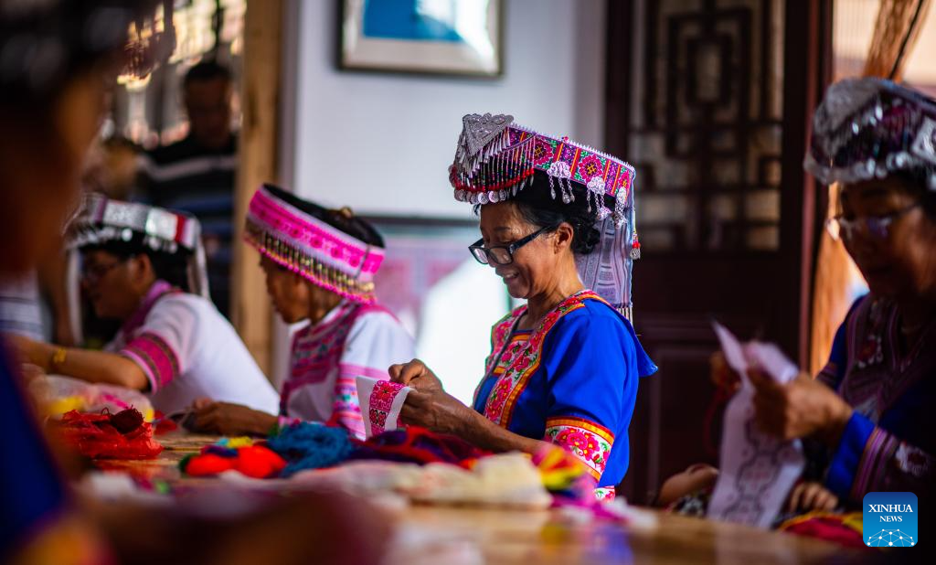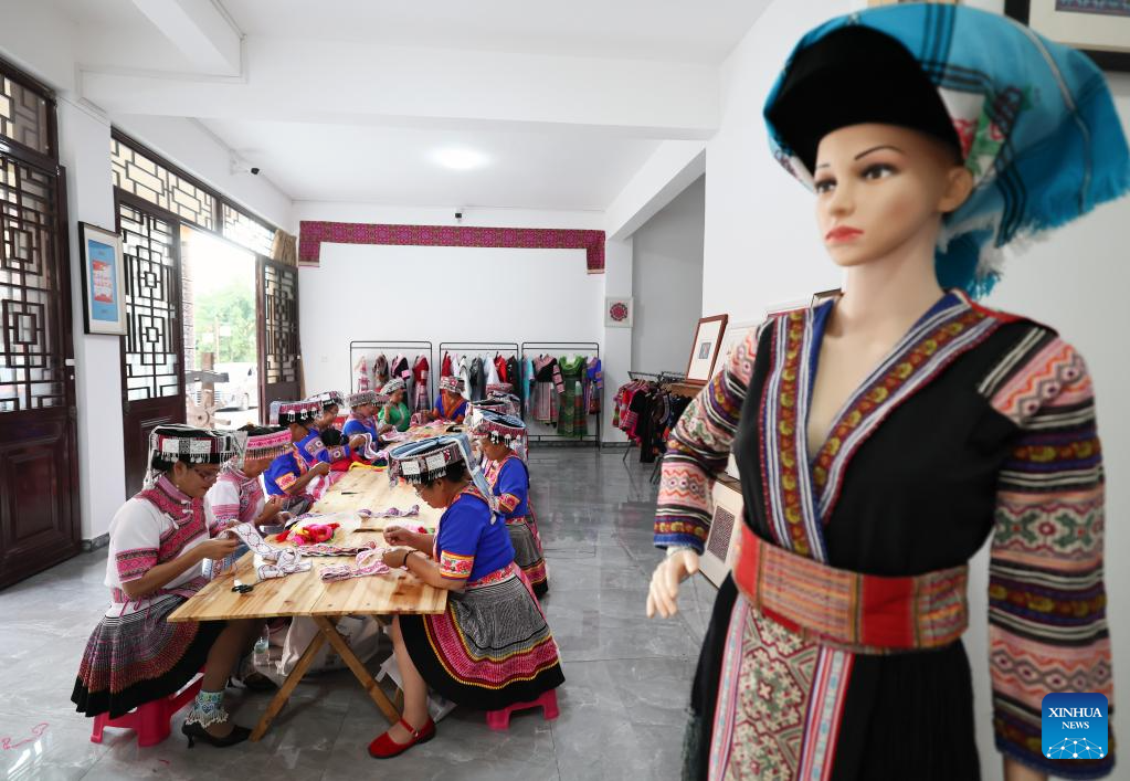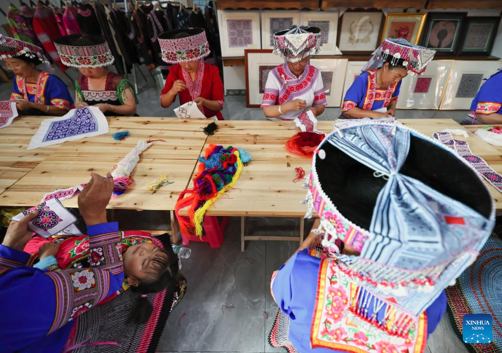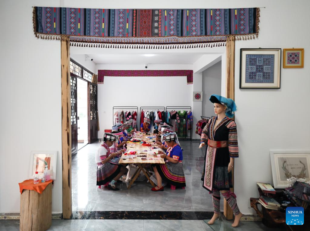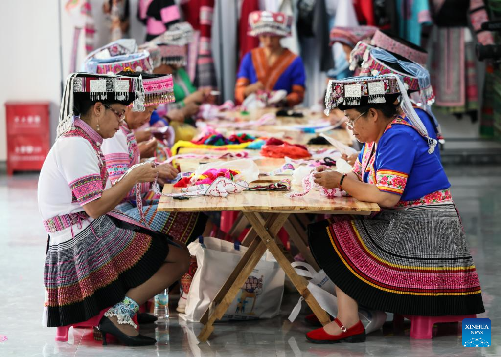 Women of Miao ethnic group make embroidery works at a workshop in Pingbian Miao Autonomous County, southwest China's Yunnan Province, June 1, 2023. Pingbian Miao Autonomous County has been making efforts to support and develop its embroidery industry, trying to provide job opportunities to local women. (Xinhua/Lan Hongguang)