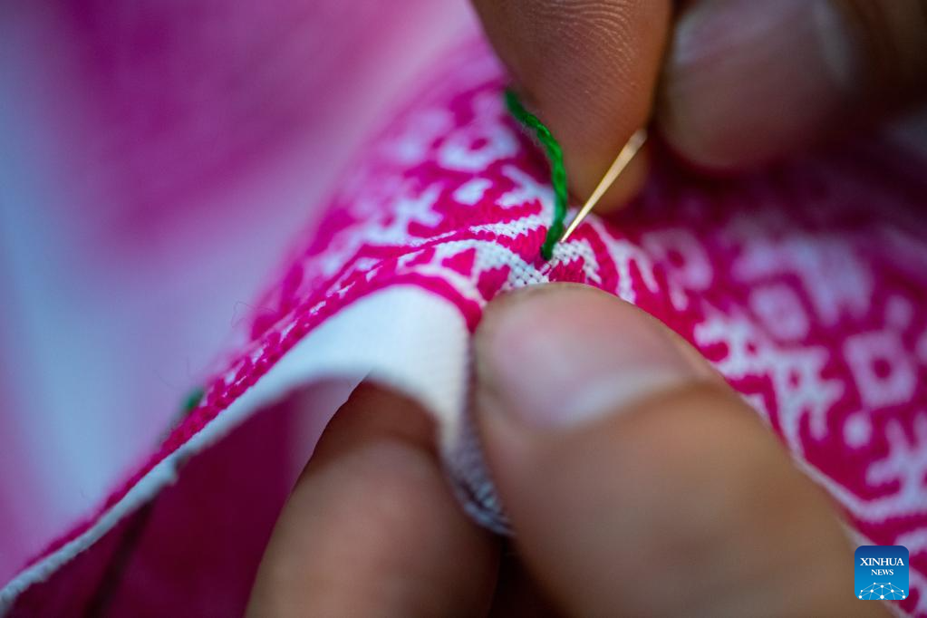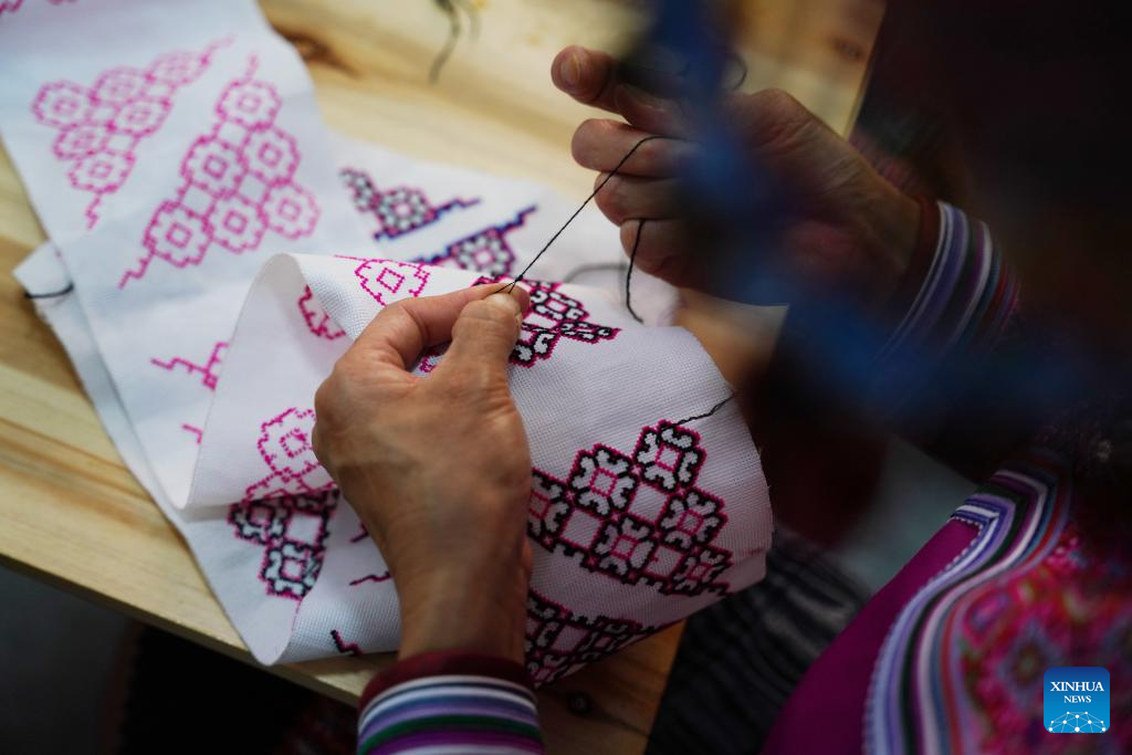 A woman of Miao ethnic group makes embroidery works at a workshop in Pingbian Miao Autonomous County, southwest China's Yunnan Province, June 1, 2023. Pingbian Miao Autonomous County has been making efforts to support and develop its embroidery industry, trying to provide job opportunities to local women. (Xinhua/Zhang Haobo)