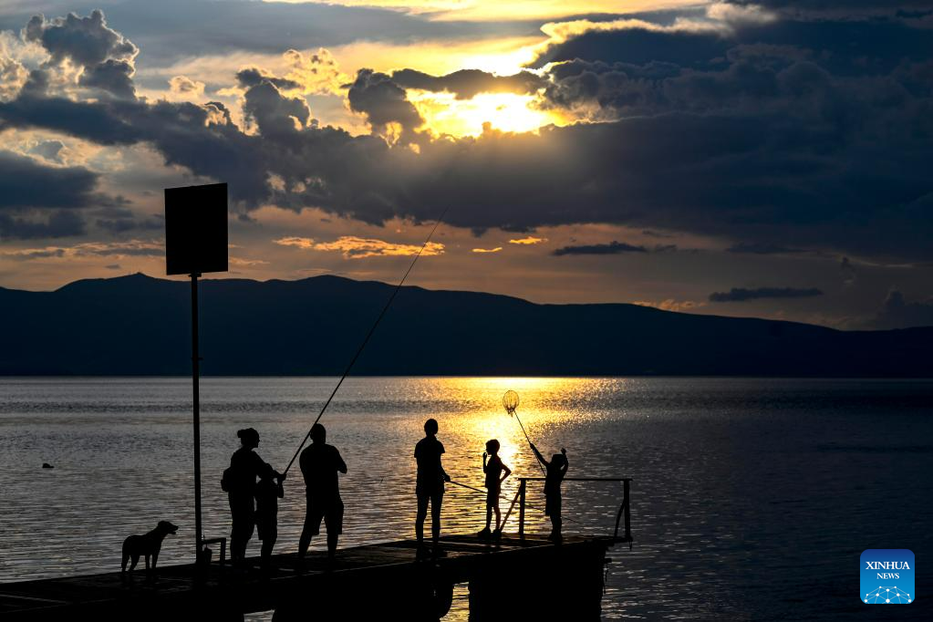 People are silhouetted against sunset at the dock of Ohrid Lake in Ohrid, North Macedonia, on June 2, 2023. (Photo by Tomislav Georgiev/Xinhua)
