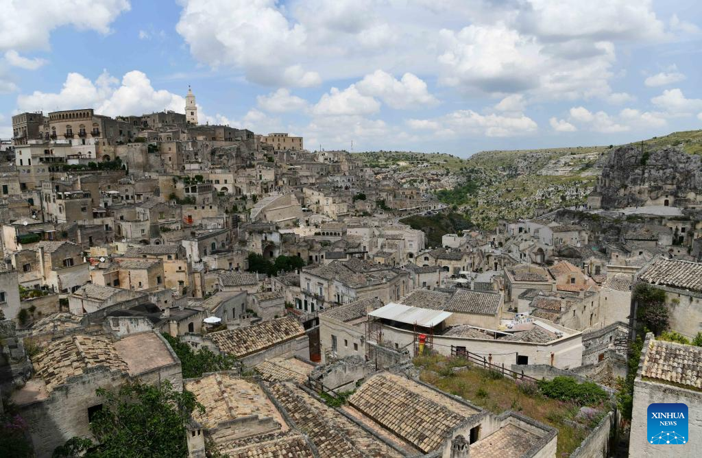 This photo taken on June 1, 2023 shows the Sassi and the Park of the Rupestrian Churches of Matera in the southern region of Basilicata, Italy. Matera's Sassi and Park of the Rupestrian Churches were inscribed on the UNESCO World Heritage List in 1993. (Xinhua/Jin Mamengni)