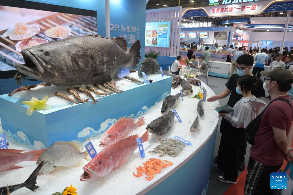 This photo taken on June 2, 2023 shows fish products displayed during the 2023 China (Fuzhou) International Seafood &Fisheries Expo in Fuzhou, capital of southeast China's Fujian Province. Hundreds of enterprises from both home and abroad participated in the expo, which opened here on Friday. (Xinhua/Lin Shanchuan)