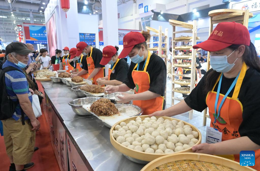 Staff members make seafood products during the 2023 China (Fuzhou) International Seafood &Fisheries Expo in Fuzhou, capital of southeast China's Fujian Province, June 2, 2023. Hundreds of enterprises from both home and abroad participated in the expo, which opened here on Friday. (Xinhua/Lin Shanchuan)