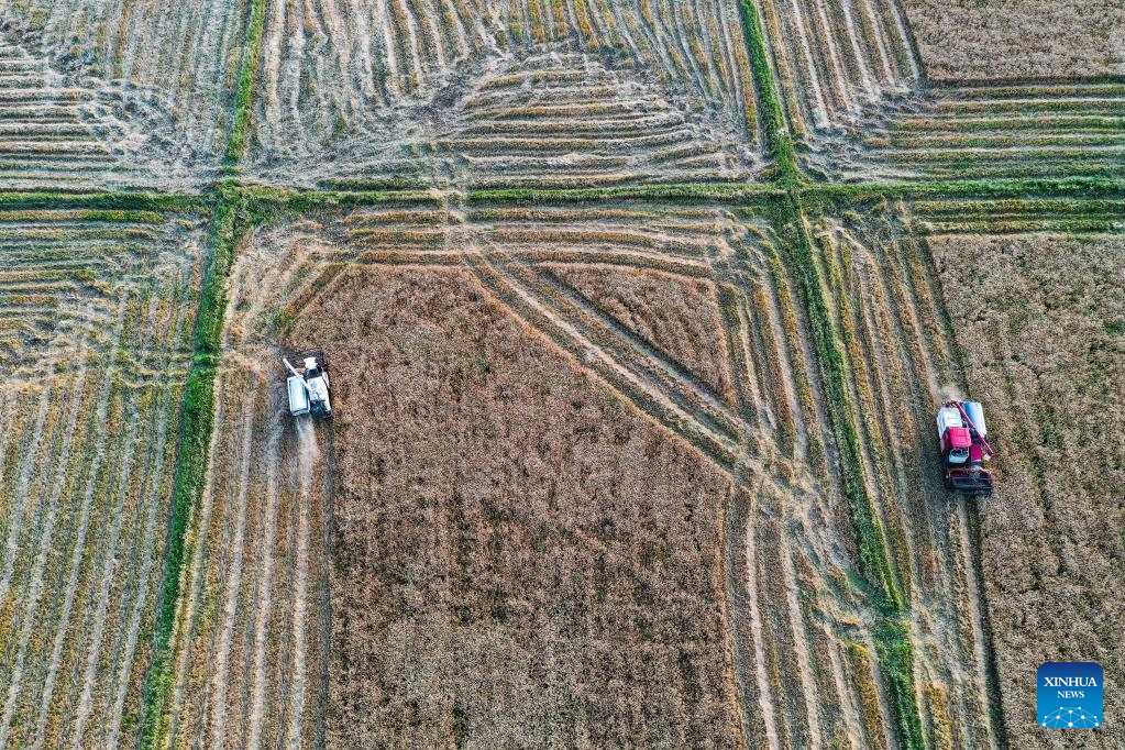 This aerial photo shows harvesters harvesting crops in a wheat field at Yantang Village of Kaiyang County in Guiyang, southwest China's Guizhou Province, May 31, 2023. (Xinhua/Yang Wenbin)
