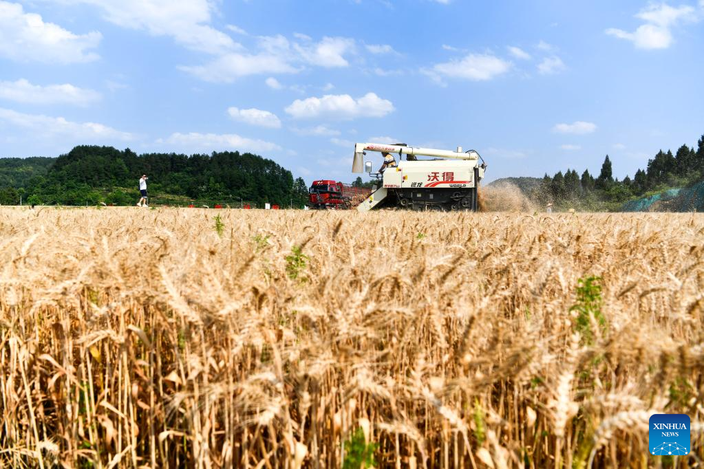 A harvester harvests crops in a wheat field at Yantang Village of Kaiyang County in Guiyang, southwest China's Guizhou Province, May 31, 2023. (Xinhua/Yang Wenbin)