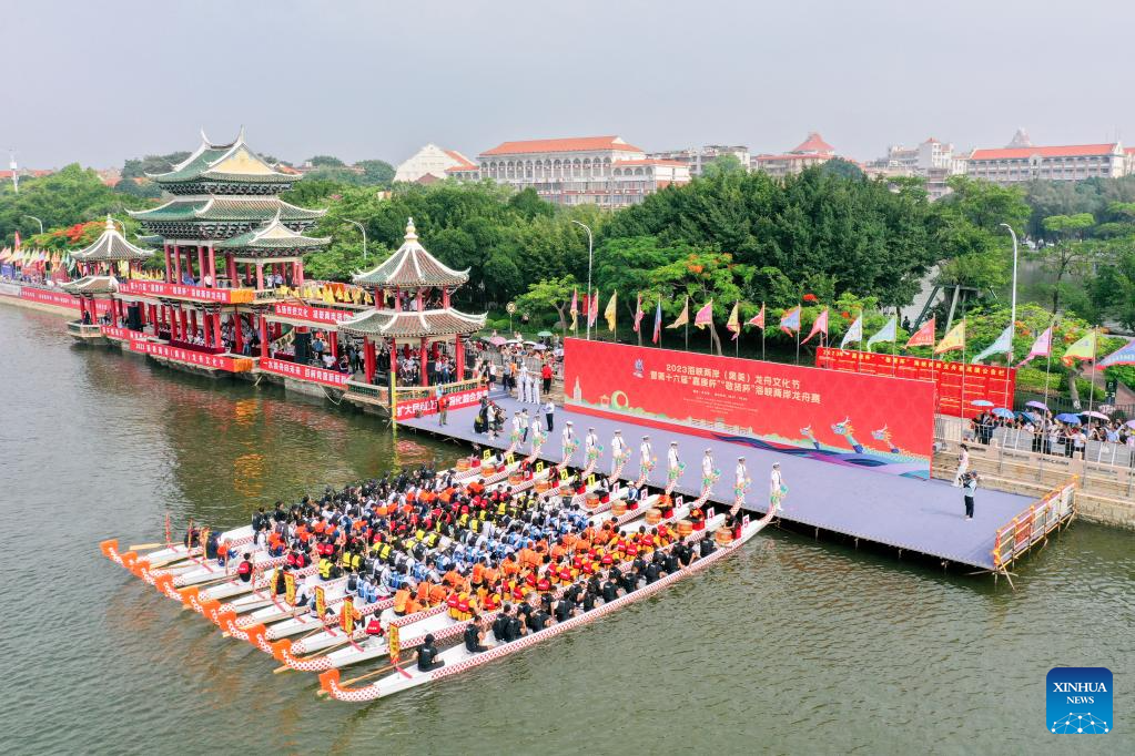 This aerial photo taken on June 3, 2023 shows rowers from both sides of the Taiwan Strait attending the opening ceremony of a dragon boat cultural festival in Xiamen, southeast China's Fujian Province. To greet the Dragon Boat Festival, which falls on June 22 this year, a total of 47 teams from both sides of the Taiwan Strait took part in the dragon boat race in the coastal city of Xiamen. (Xinhua/Jiang Kehong)