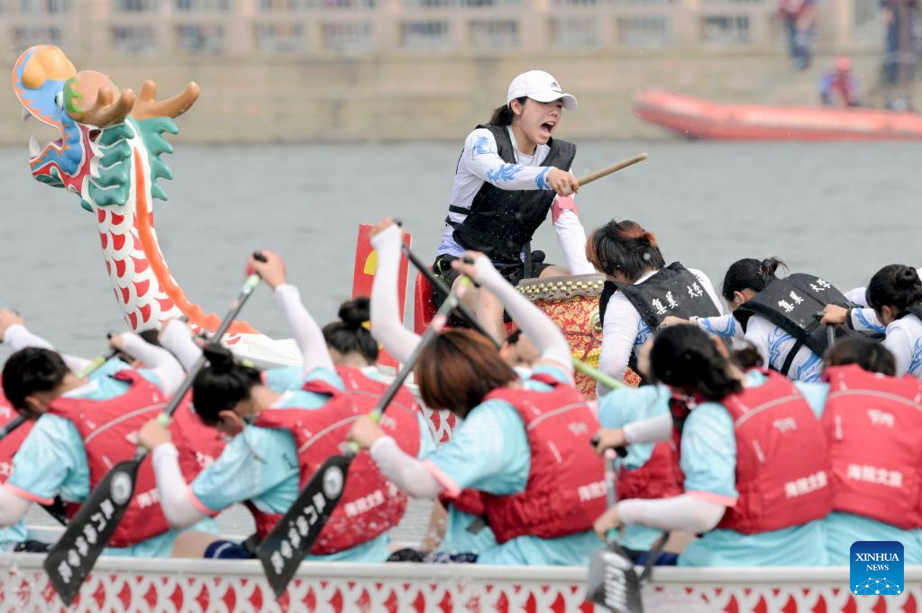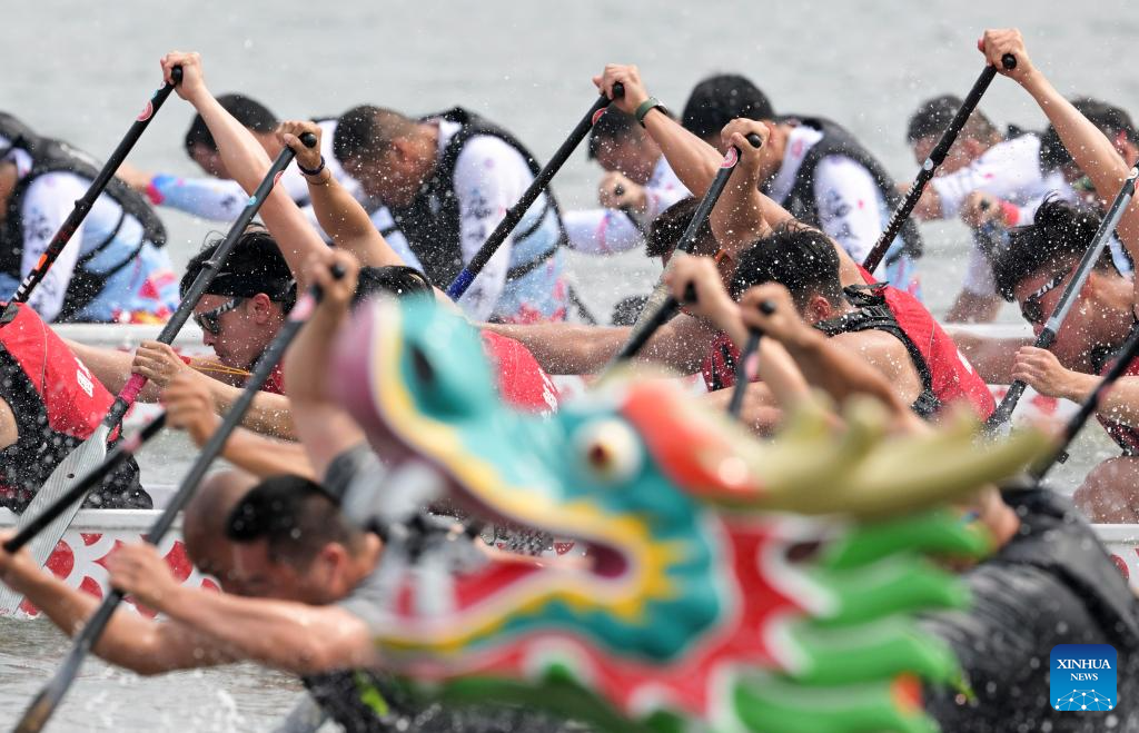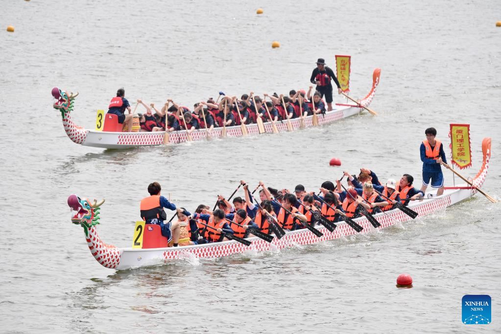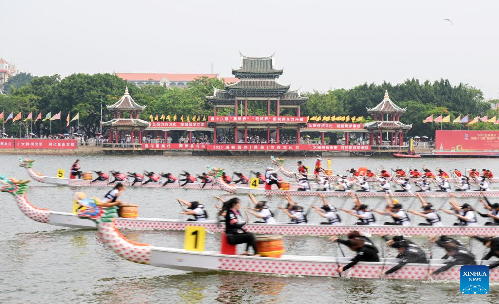 Rowers from both sides of the Taiwan Strait race on the water during a dragon boat cultural festival in Xiamen, southeast China's Fujian Province, June 3, 2023. To greet the Dragon Boat Festival, which falls on June 22 this year, a total of 47 teams from both sides of the Taiwan Strait took part in the dragon boat race in the coastal city of Xiamen. (Xinhua/Wei Peiquan)