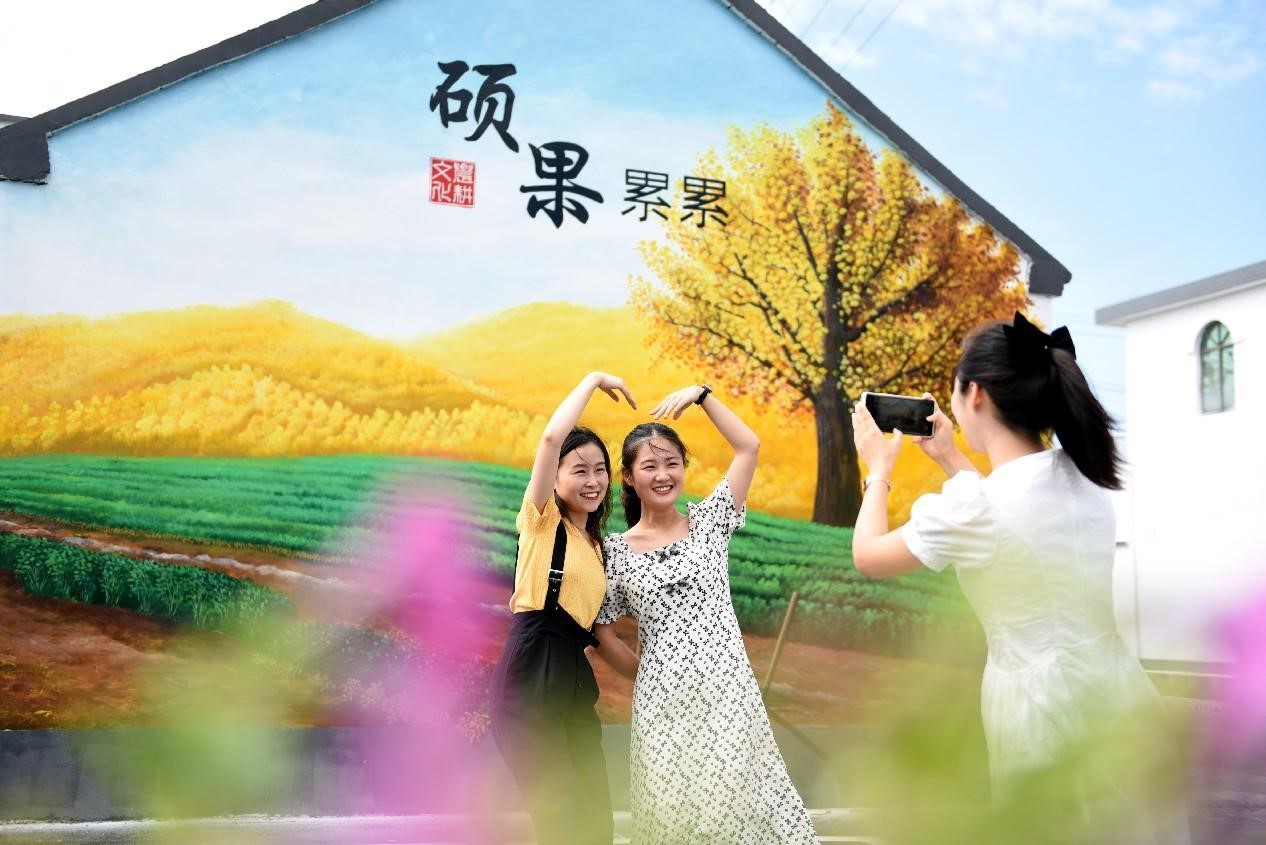 Visitors pose for pictures in front of a wall painting in Huangjindian village, Tancheng county, Linyi, east China's Shandong province. (People's Daily Online/Fang Dehua)