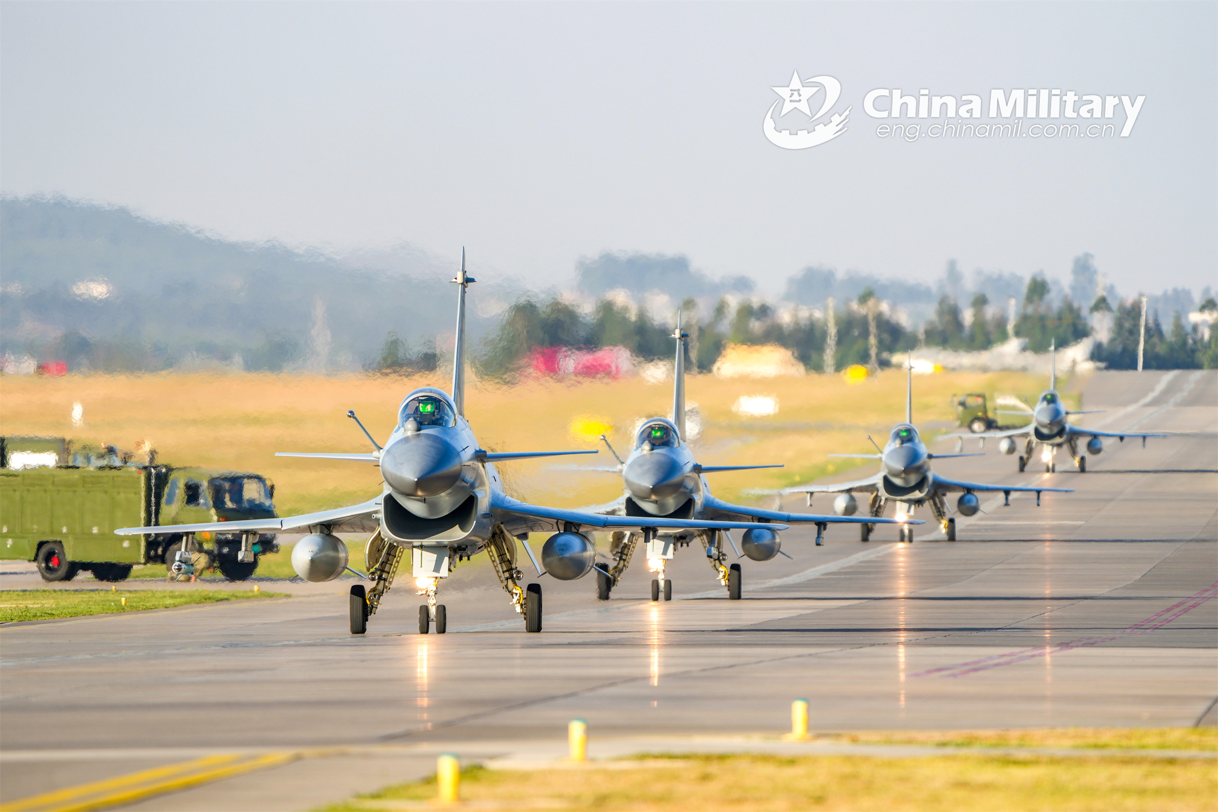 J-10 fighter jets attached to an aviation brigade of the air force under the PLA Southern Theater Command participate in a close formation taxi, known as "Elephant Walk", during a recent flight training exercise. The exercise focused on training items of low-altitude penetration, force-on-force air combat, etc. (eng.chinamil.com.cn/Photo by Wang Guoyun)