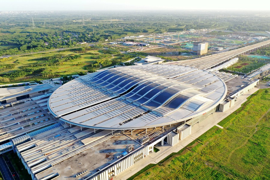 This aerial photo taken on June 2, 2023 shows the Xiong'an Railway Station in Xiong'an New Area, north China's Hebei Province. (Xinhua/Zhu Xudong)