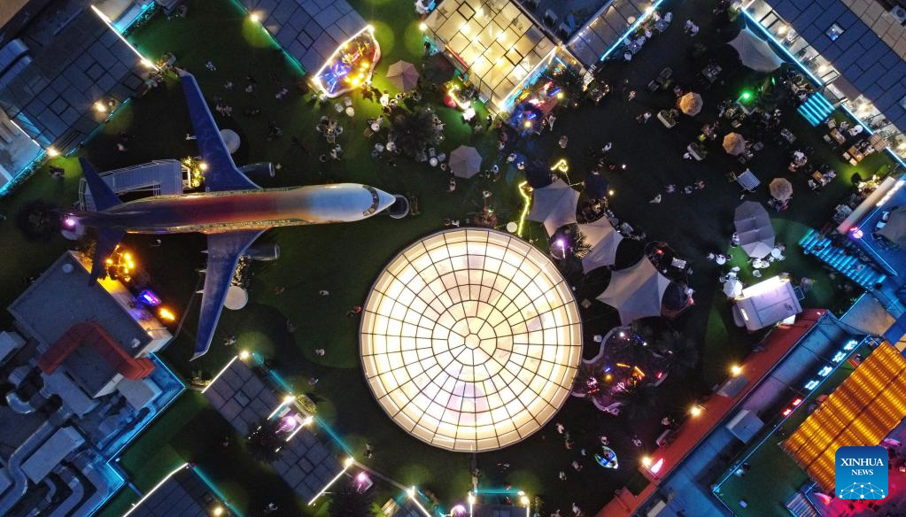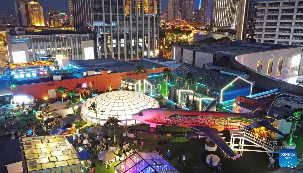 This aerial photo taken on June 2, 2023 shows people having fun on top of a commercial complex in Heping District, north China's Tianjin. Transformed from four vacant buildings, a commercial complex was unveiled in Heping District of Tianjin recently. This commercial complex not only offers people with shopping malls but also leisure spaces such as rooftop parks and pocket parks. The airplane themed bar and other entertainment spaces located on top of the commercial complex gained popularity for the surrounding business area. (Xinhua/Zhao Zishuo)