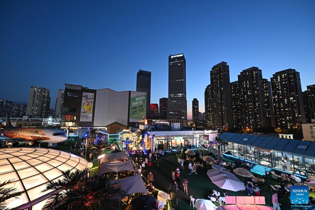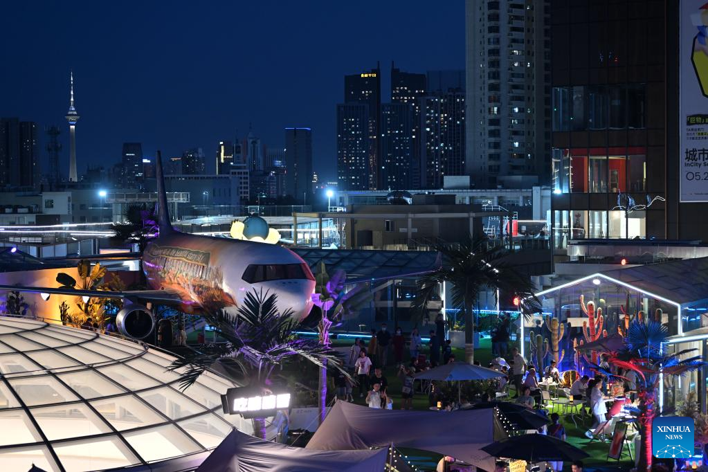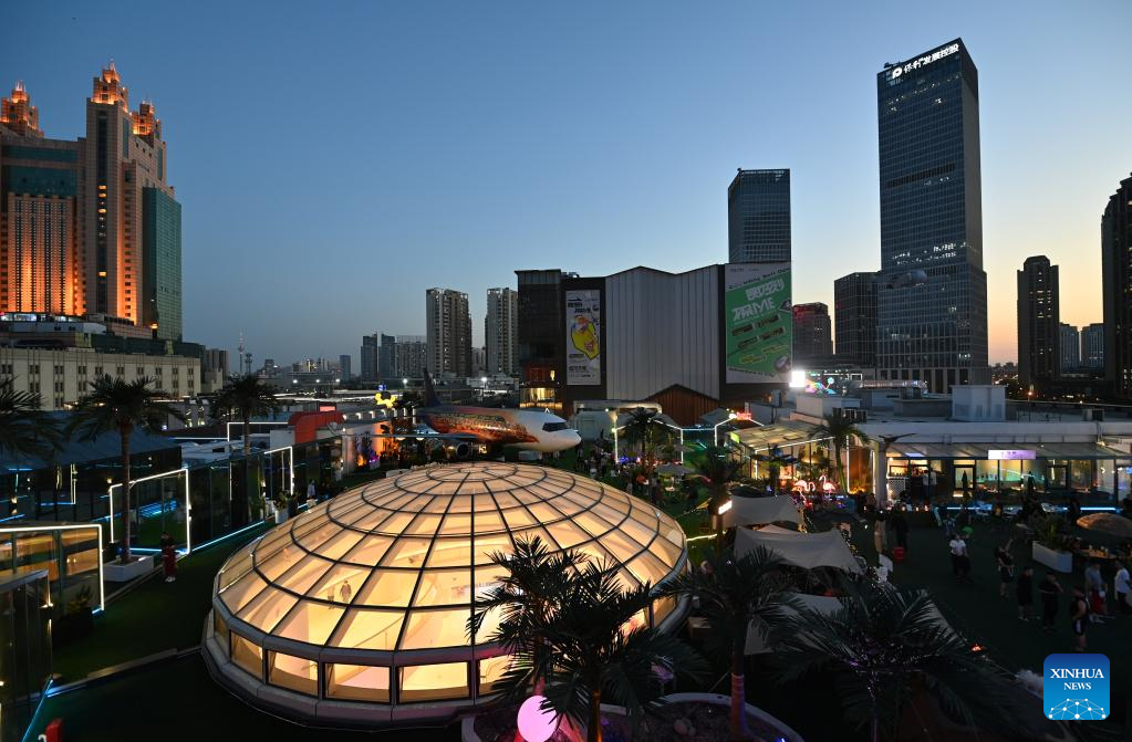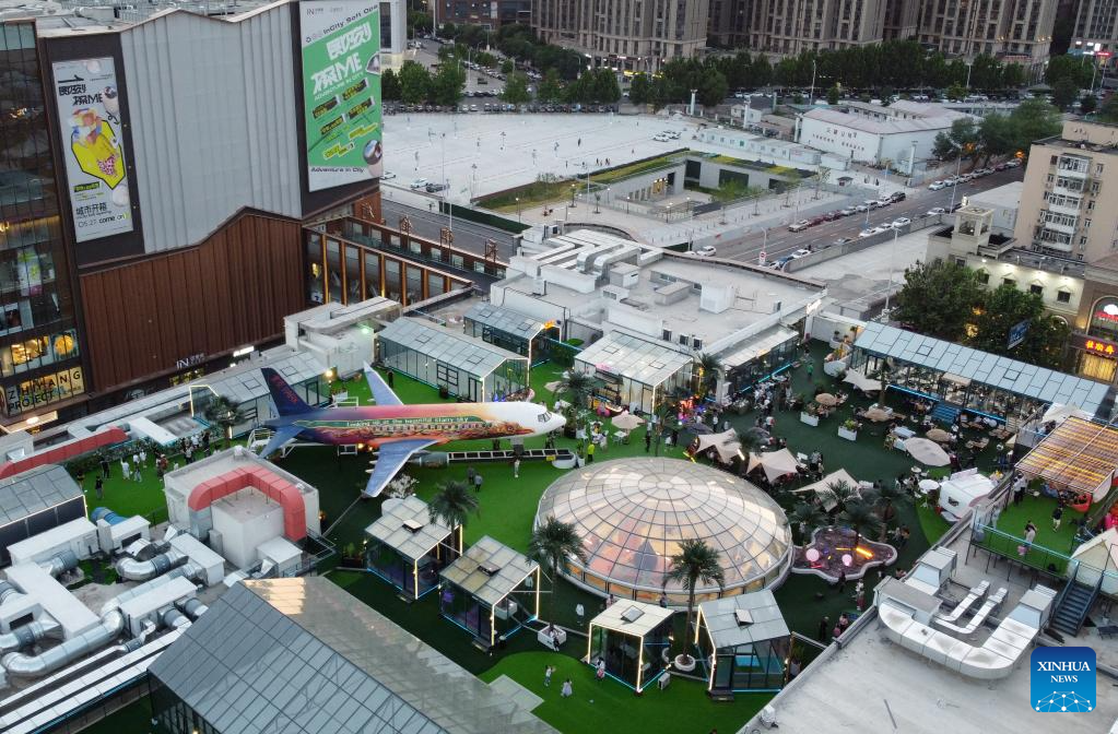 This photo taken on June 2, 2023 shows people having fun on top of a commercial complex in Heping District, north China's Tianjin. Transformed from four vacant buildings, a commercial complex was unveiled in Heping District of Tianjin recently. This commercial complex not only offers people with shopping malls but also leisure spaces such as rooftop parks and pocket parks. The airplane themed bar and other entertainment spaces located on top of the commercial complex gained popularity for the surrounding business area. (Xinhua/Zhao Zishuo)