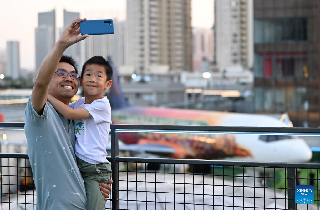 A man holds his child and takes selfies on top of a commercial complex in Heping District, north China's Tianjin, June 2, 2023. Transformed from four vacant buildings, a commercial complex was unveiled in Heping District of Tianjin recently. This commercial complex not only offers people with shopping malls but also leisure spaces such as rooftop parks and pocket parks. The airplane themed bar and other entertainment spaces located on top of the commercial complex gained popularity for the surrounding business area. (Xinhua/Li Ran)