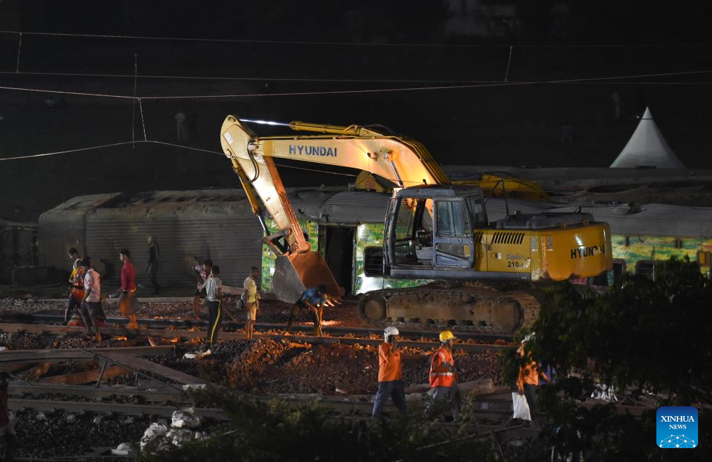 Rescuers remove debris of damaged trains from the railway track at the site of a train collision in Balasore district of eastern Indian state of Odisha, June 4, 2023. (Xinhua/Javed Dar)