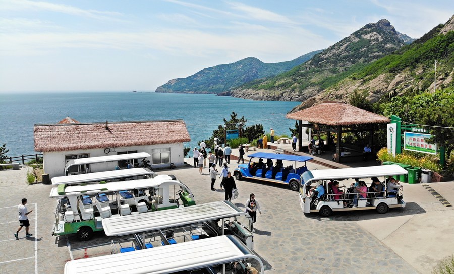Tourists take electric vehicles as they visit the Lingshan Island in Qingdao, east China's Shandong Province, June 5, 2023. (Xinhua/Li Ziheng)
