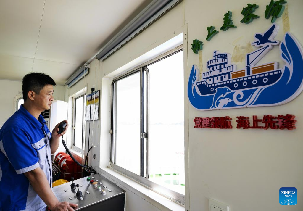 A staff member of an ocean sanitation station Yang Haishan drives a sanitation vessel in the waters of Xiamen, southeast China's Fujian Province, June 4, 2023.?(Xinhua/Jiang Kehong)