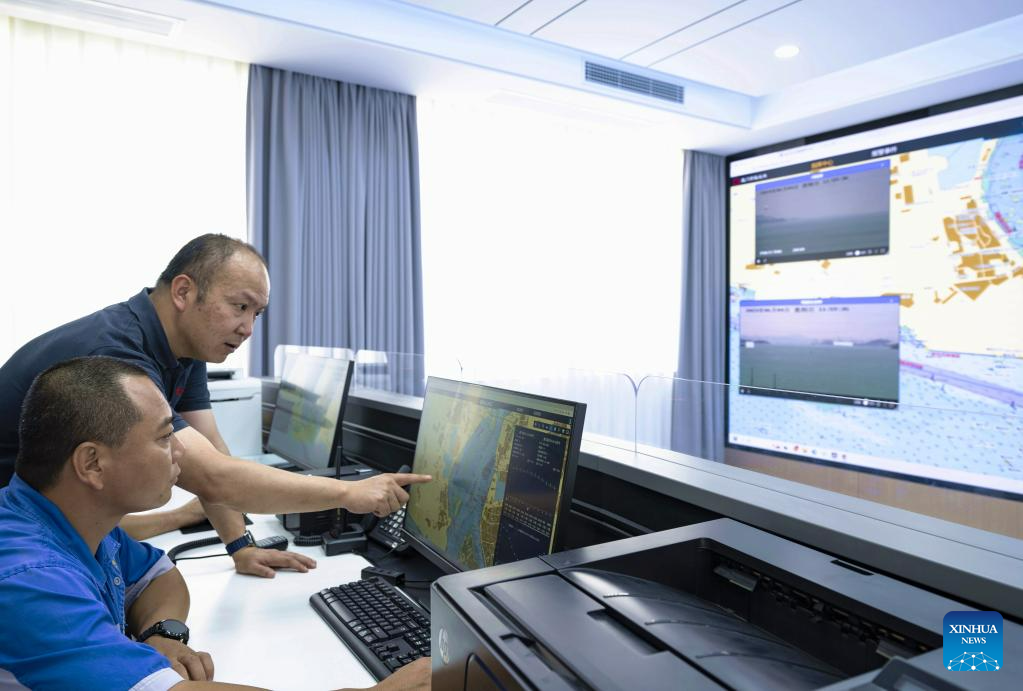 Staff members monitor stray waste in the waters of Xiamen at a sanitation dock in Xiamen, southeast China's Fujian Province, June 4, 2023.?(Xinhua/Wei Peiquan)