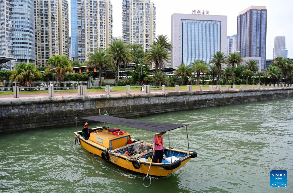 This photo shows a sanitation boat in the waters of Xiamen, southeast China's Fujian Province, June 4, 2023.?(Xinhua/Wei Peiquan)