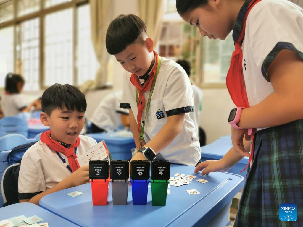 This undated photo shows students learning about garbage classification at a school in Guangzhou, south China's Guangdong Province. TO GO WITH (Guangzhou urban management bureau/Handout via Xinhua)