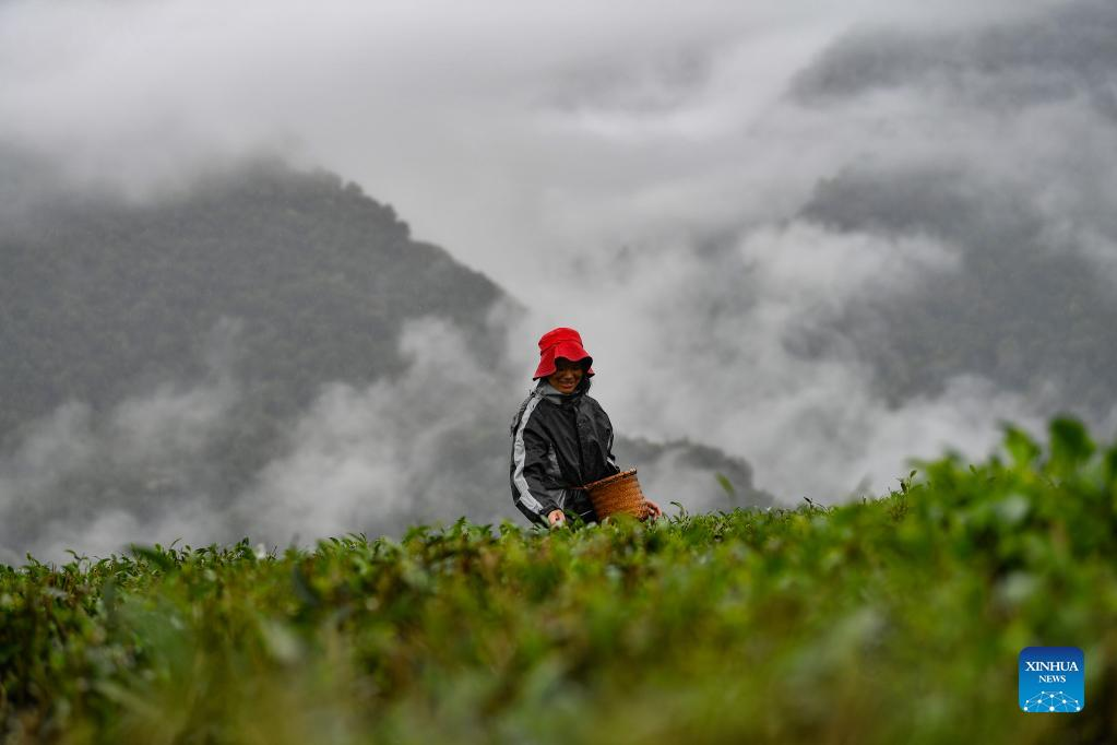Resident Gongsang Lamu picks tea leaves at Hezha village of Dexing township in Medog county, southwest China's Xizang Autonomous Region, April 16, 2022.? (Xinhua/Jigme Dorje)
