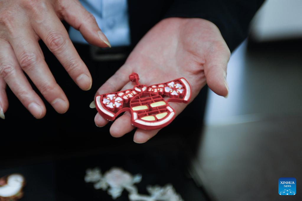 Jiang Manzong shows a Pankou (knot button) at a training institute for Longfeng Cheongsam in Shanghai, east China, May 31, 2023. (Xinhua/Zhu Weixi)