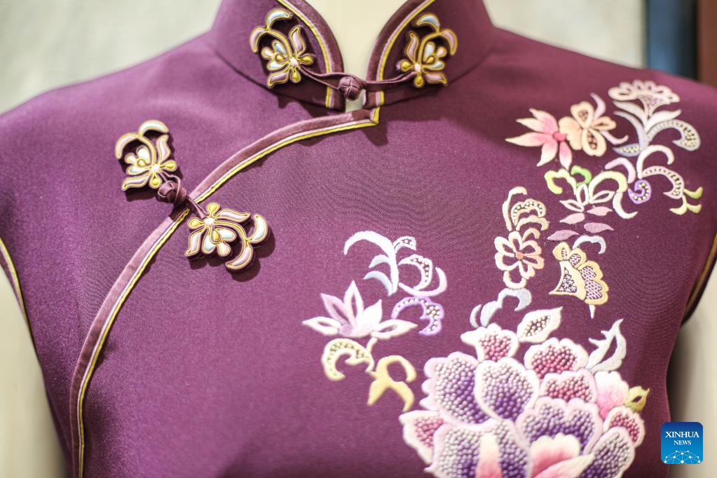 Cheongsams with dragon and phoenix patterns are seen at the Longfeng Cheongsam store in Shanghai, east China, May 30, 2023. (Xinhua/Xin Mengchen)