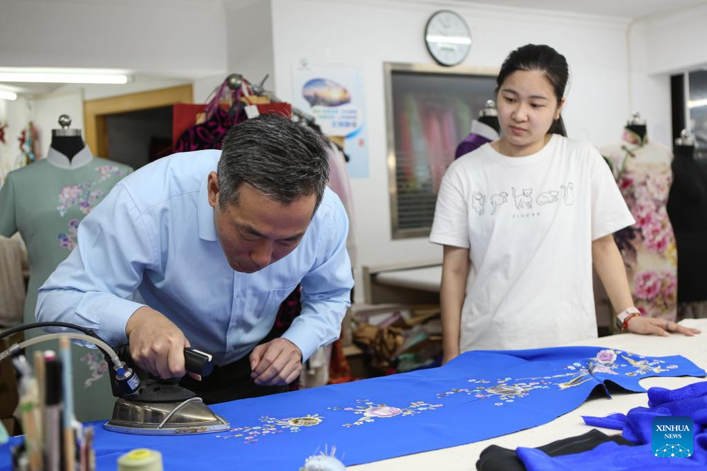 Jiang Manzong (L) irons a piece of semi-finished cheongsam at a training institute for Longfeng Cheongsam in Shanghai, east China, May 31, 2023. (Xinhua/Xin Mengchen)