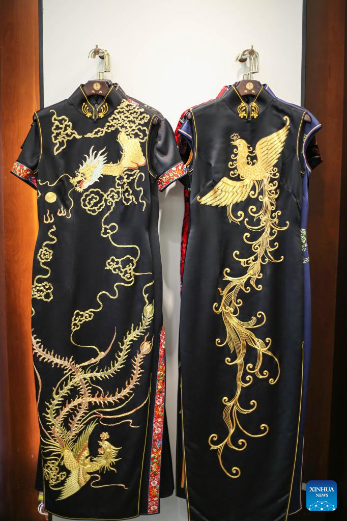 Cheongsams with dragon and phoenix patterns are seen at the Longfeng Cheongsam store in Shanghai, east China, May 30, 2023. (Xinhua/Liu Ying)