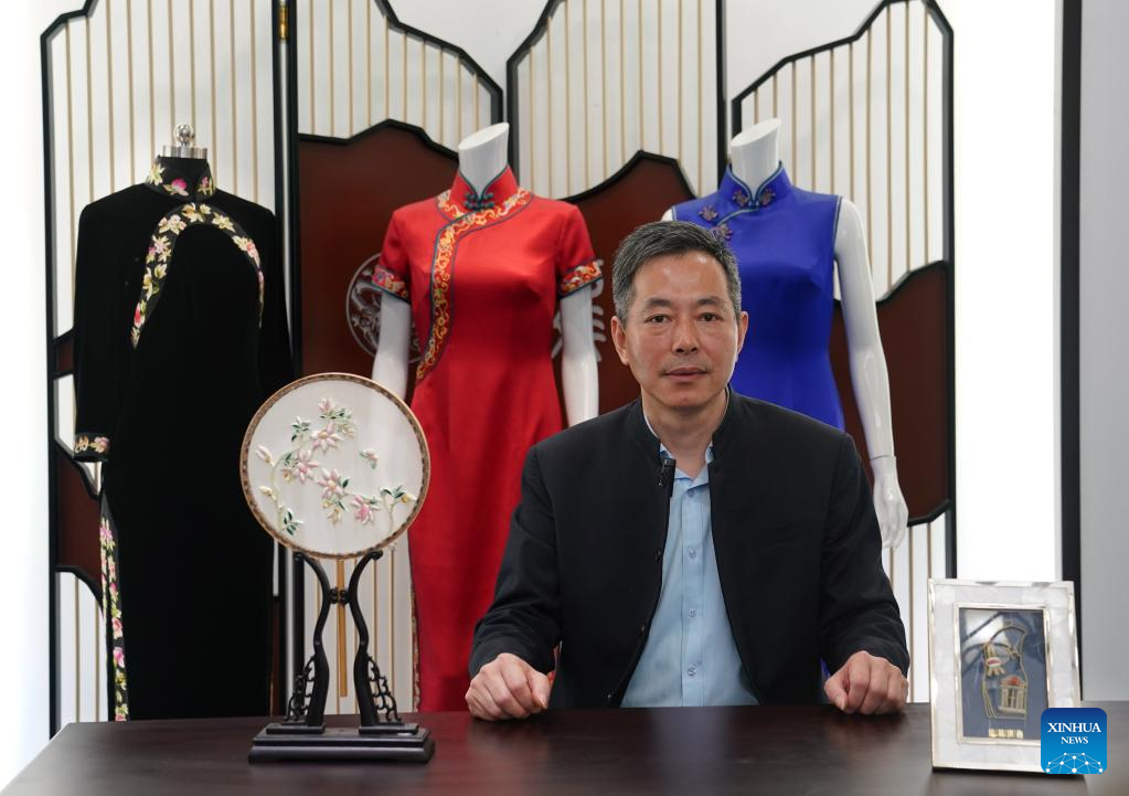 Jiang Manzong introduces the "Jixiang Ruyi" cheongsam at the Longfeng Cheongsam store in east China's Shanghai, May 30, 2023. (Xinhua/Zhu Weixi)