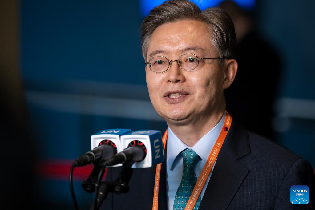 Hwang Joon-kook, the Republic of Korea's permanent representative to the United Nations, speaks to reporters after his country was elected as a non-permanent member of the UN Security Council at the UN headquarters in New York, on June 6, 2023. Algeria, Guyana, the Republic of Korea, Sierra Leone, and Slovenia were elected non-permanent members of the UN Security Council on Tuesday for a two-year term. The newly elected members will take up their new responsibilities on Jan. 1, 2024, and serve till Dec. 31, 2025. (Loey Felipe/UN Photo/Handout via Xinhua)