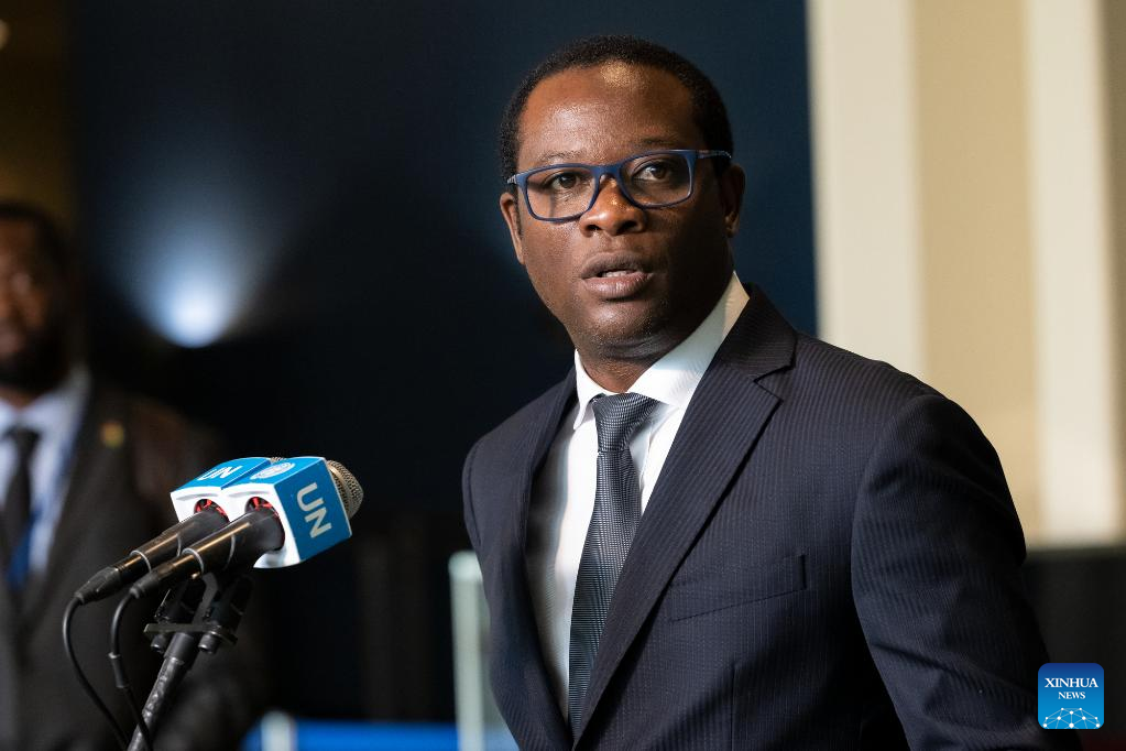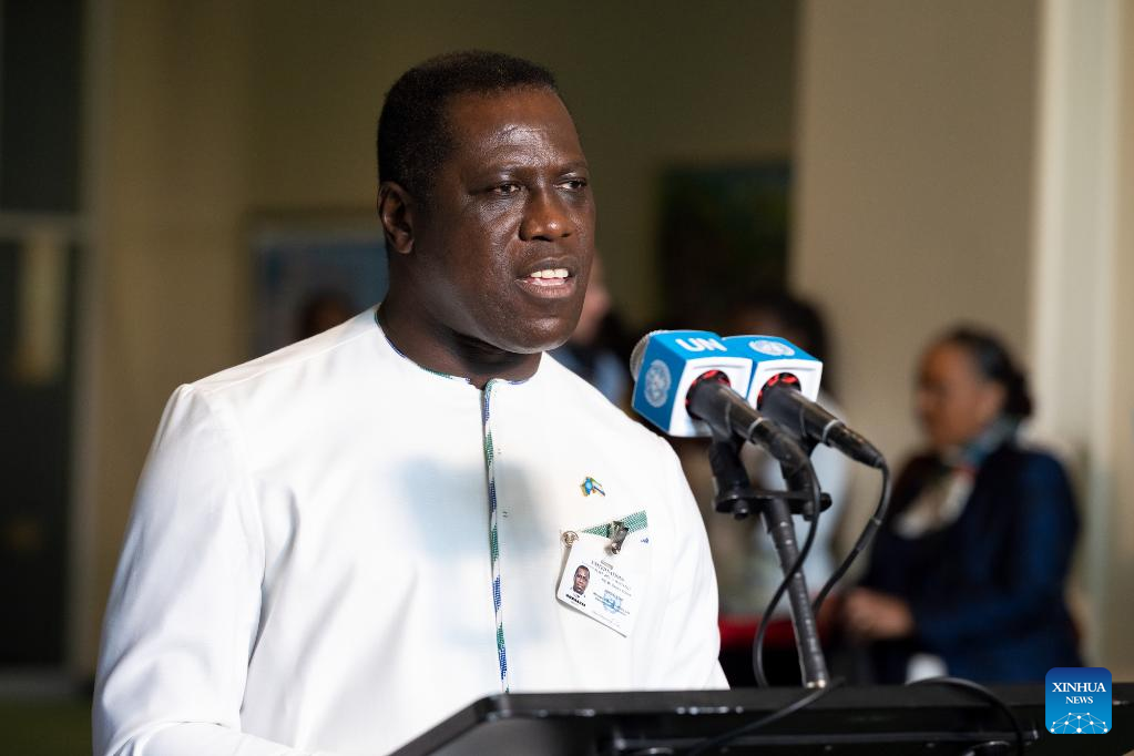Sierra Leonean Foreign Minister David Francis speaks to reporters after his country was elected as a non-permanent member of the UN Security Council at the UN headquarters in New York, on June 6, 2023. Algeria, Guyana, the Republic of Korea, Sierra Leone, and Slovenia were elected non-permanent members of the UN Security Council on Tuesday for a two-year term. The newly elected members will take up their new responsibilities on Jan. 1, 2024, and serve till Dec. 31, 2025. (Loey Felipe/UN Photo/Handout via Xinhua)