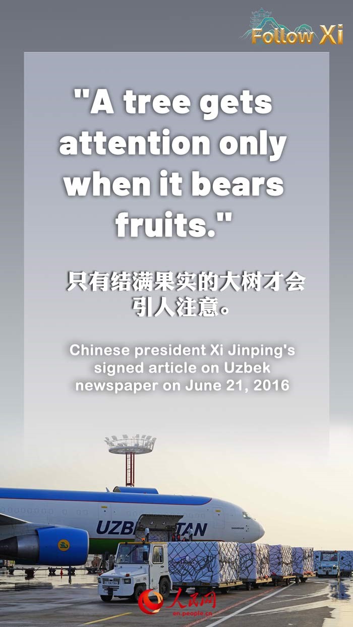 A Uzbek proverb goes, "A tree gets attention only when it bears fruits." China-Uzbekistan cooperation across the board has yielded fruitful results, and has benefited and won the support of our two peoples. I believe that in realizing our respective national development and rejuvenation, our two countries will join hands and write a glorious new chapter of China-Uzbekistan friendship.