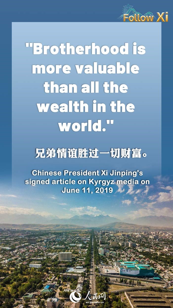As a Kyrgyz saying goes, "Brotherhood is more valuable than all the wealth in the world." Likewise, the Chinese often say, "When brothers are of the same mind, they can cut metal through." In a world undergoing changes unseen in a century, it is important for China and Kyrgyzstan to join hands and meet challenges together to ensure the sustained, steady and healthy growth of our bilateral relations. That is a historical responsibility we share.