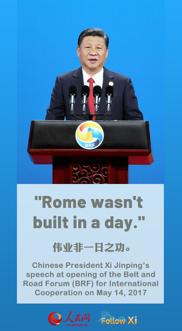 An ancient Chinese saying goes, "A long journey can be covered only by taking one step at a time". Similarly, there is an Arab proverb which says that the Pyramid was built by piling one stone on another. In Europe, there is also the saying that "Rome wasn't built in a day." The Belt and Road Initiative is a great undertaking which requires dedicated efforts. Let us pursue this initiative step by step and deliver outcome one by one. By doing so, we will bring true benefit to both the world and all our people!