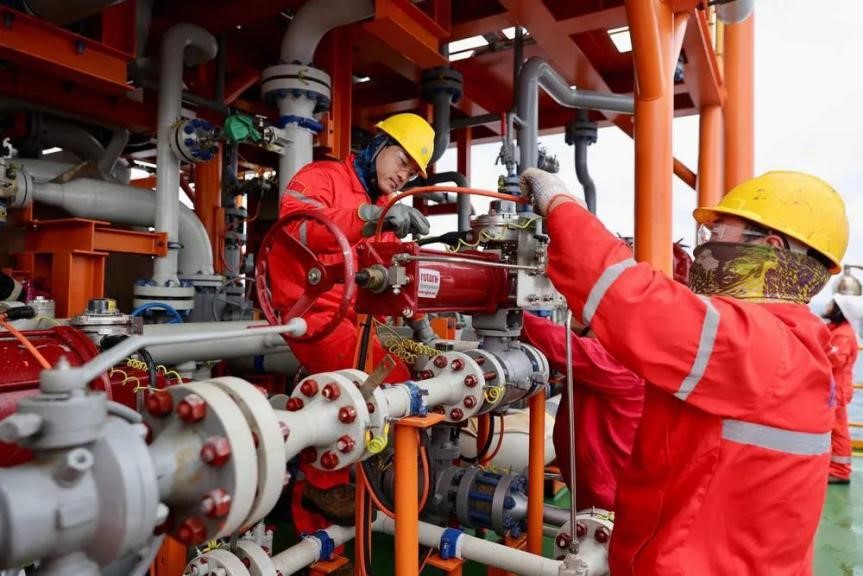 Technicians adjust equipment of China's offshore carbon storage project. (Photo provided by the China National Offshore Oil Corporation)