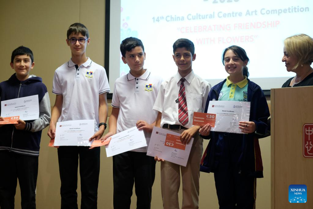 Students attend an awards ceremony for the 14th "Imagining China" children's art competition in Valletta, Malta, on June 6, 2023. An exhibition showcasing the tea culture of Xi'an, Shaanxi Province in northwest China, commenced on Tuesday at the China Cultural Centre in Malta. (Photo by Jonathan Borg/Xinhua)