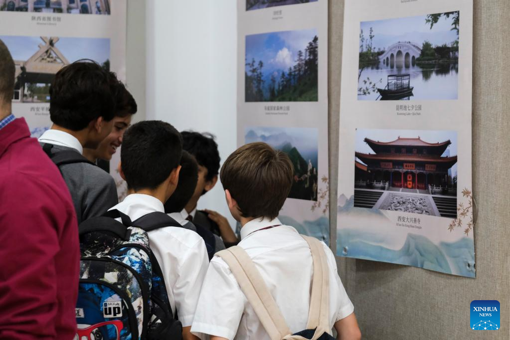 Students view an award-winning artwork at an awards ceremony for the 14th "Imagining China" children's art competition in Valletta, Malta, on June 6, 2023. An exhibition showcasing the tea culture of Xi'an, Shaanxi Province in northwest China, commenced on Tuesday at the China Cultural Centre in Malta. (Photo by Jonathan Borg/Xinhua)