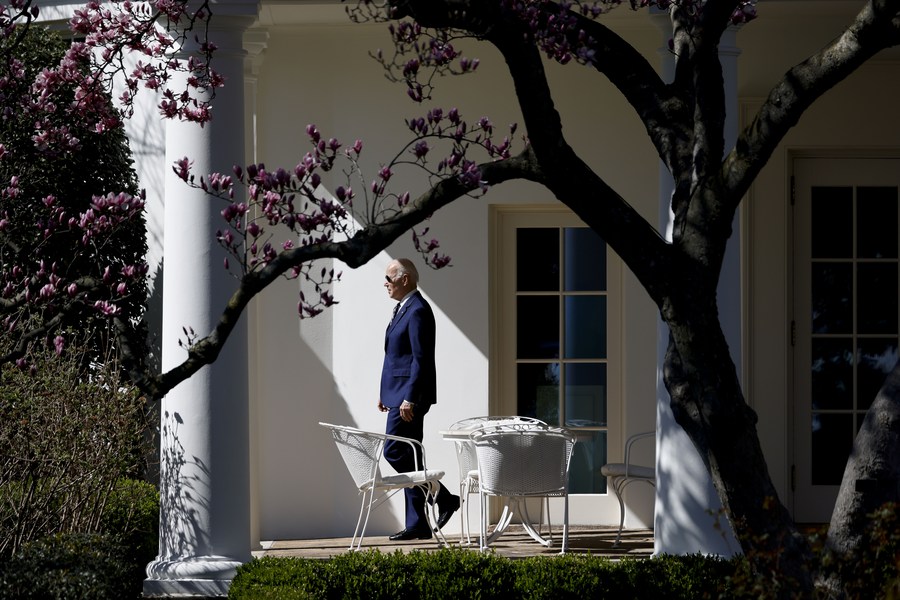 Photo taken on March 9, 2023 shows U.S. President Joe Biden walks by the South Lawn at the White House in Washington, D.C., the United States. (Photo by Ting Shen/Xinhua)