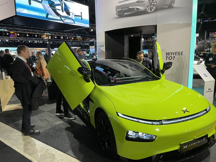 People look at an electric vehicle of XPeng during the Swedish eCarExpo 2022 in Stockholm, Sweden, April 29, 2022.(Xinhua/Fu Yiming)