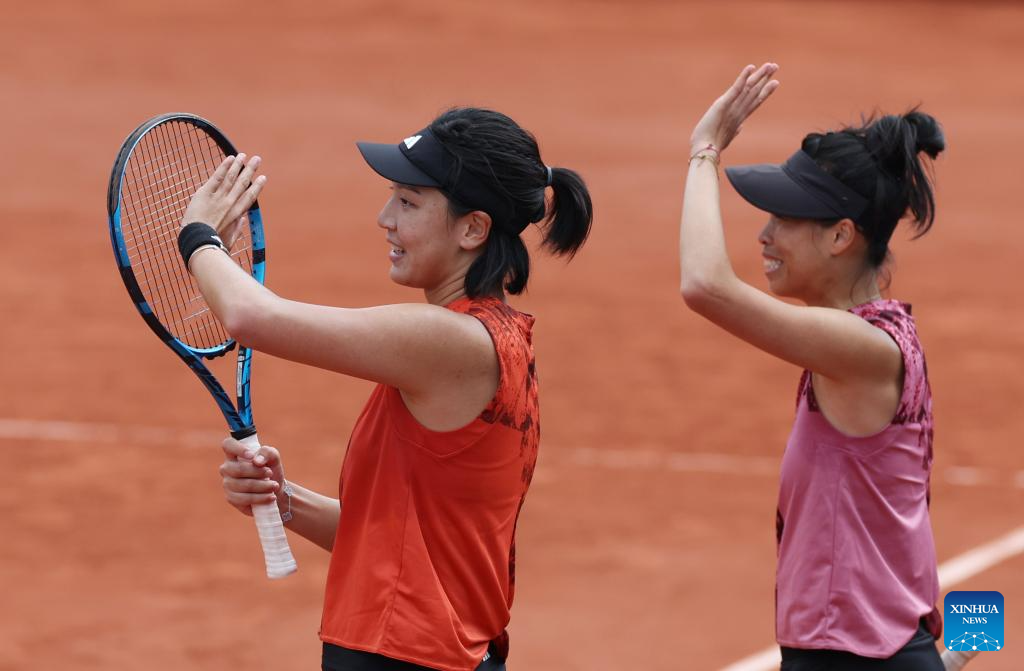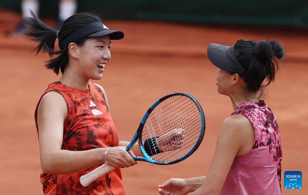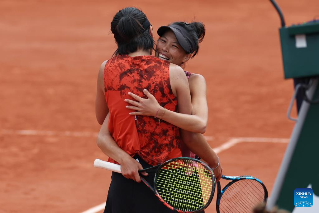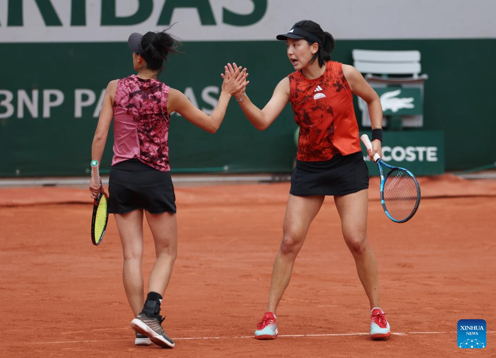 Wang Xinyu (L) of China/Hsieh Su-Wei of Chinese Taipei celebrate during the women's doubles quarterfinals between Wang Xinyu of China/Hsieh Su-Wei of Chinese Taipei and Veronika Kudermetova/Liudmila Samsonova of Russia at the French Open tennis tournament at Roland Garros in Paris, France, June 7, 2023. (Xinhua/Gao Jing)