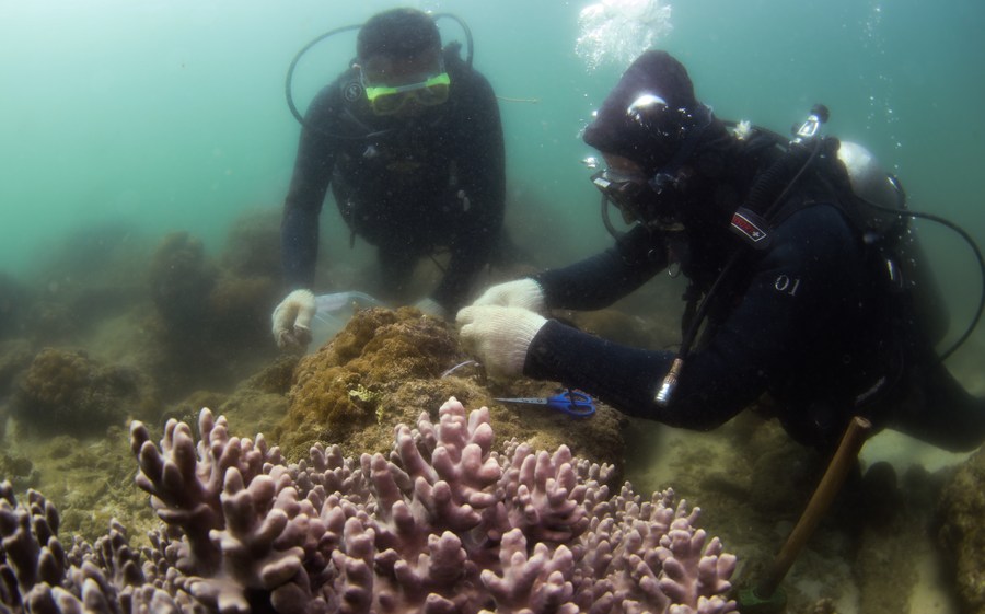 Wang Fengguo (R) transplants corals at a marine ranch in the sea area of Wuzhizhou Island in Sanya, south China's Hainan Province, May 17, 2023. (Xinhua/Yang Guanyu)