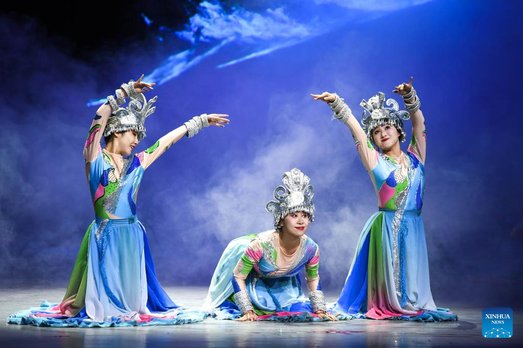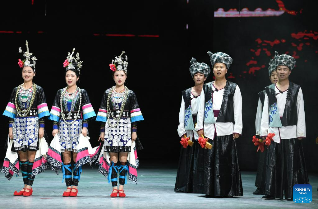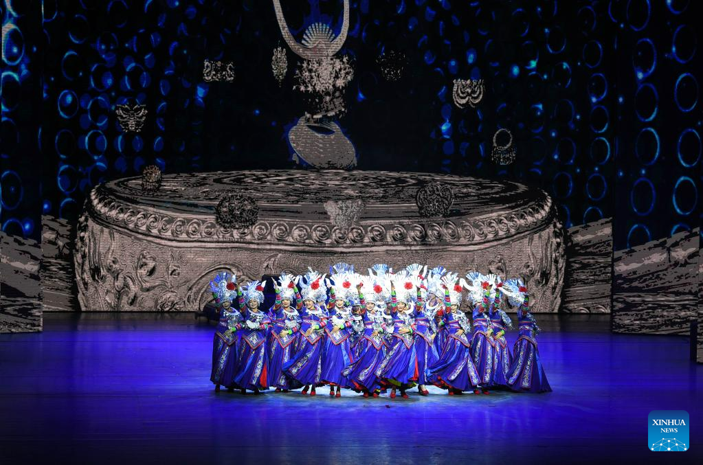 Actors perform in the show "Colorful Guizhou Style" at Guiyang Grand Theatre in Guiyang, southwest China's Guizhou Province, June 5, 2023. The "Colorful Guizhou Style" show, which debuted in 2006, has been performed in over 40 countries or regions worldwide and seen by over 10 million people. The show illustrates the vibrant ethnic culture of Guizhou and the hospitable people living there. (Xinhua/Yang Wenbin)