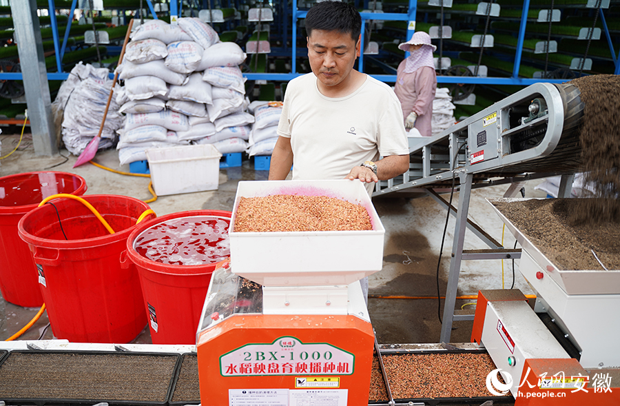 A worker checks the operation of an rice seedling breeding machine at an intelligent seedling cultivation center in the Munan agricultural industrial park in Jin'an district, Lu'an city, east China's Anhui Province. (People's Daily Online/Wang Rui)