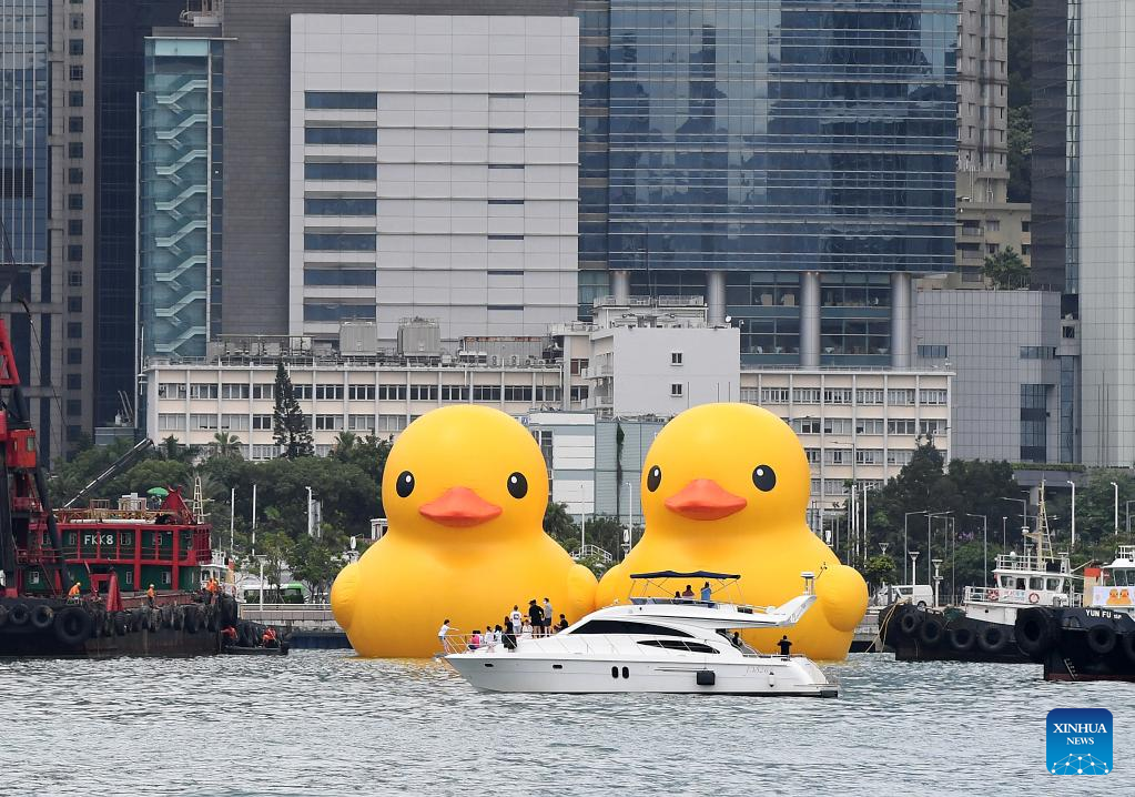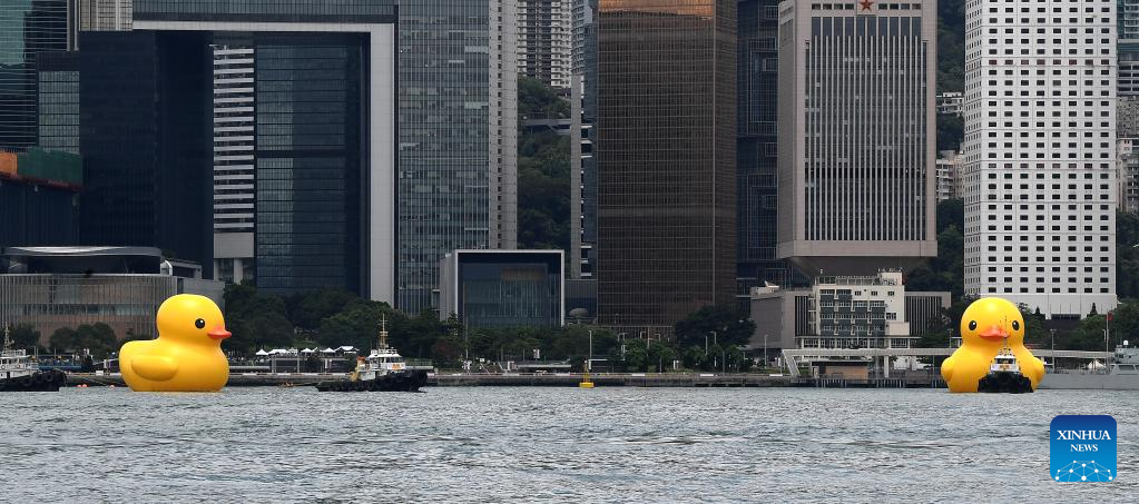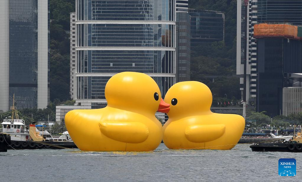 HONG KONG, June 9 (Xinhua) -- A pair of giant rubber ducks captured the attention of Hongkongers on Friday as they floated in Victoria Harbor as part of a public art exhibition that aims to bring more joy to the city.