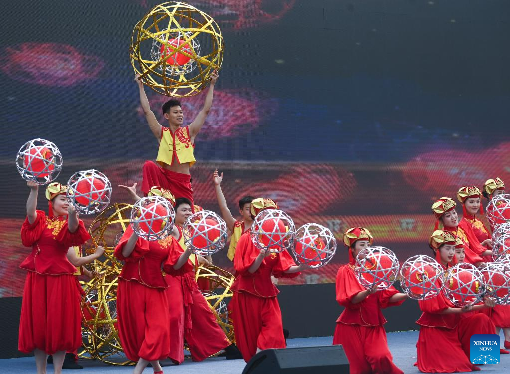 Actors perform Linping "Gundeng" (rolling lanterns), an intangible cultural heritage, during an activity marking the upcoming Cultural and Natural Heritage Day in Hangzhou, east China's Zhejiang Province, June 9, 2023. A series of activities in celebration of the upcoming Cultural and Natural Heritage Day were held at the Gongshu Canal Sports Park in Hangzhou, showcasing 66 Chinese intangible cultural heritages which are inscribed at UNESCO, national, provincial, municipal or district levels. (Xinhua/Xu Yu)