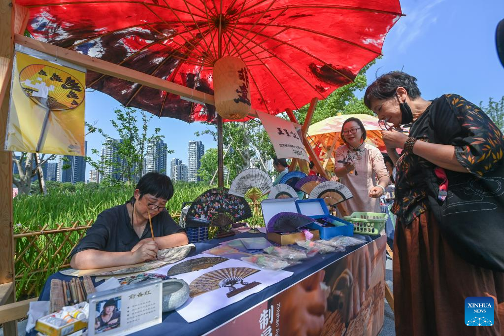 People view a demonstration of traditional Chinese fan making techniques during an activity marking the upcoming Cultural and Natural Heritage Day in Hangzhou, east China's Zhejiang Province, June 9, 2023. A series of activities in celebration of the upcoming Cultural and Natural Heritage Day were held at the Gongshu Canal Sports Park in Hangzhou, showcasing 66 Chinese intangible cultural heritages which are inscribed at UNESCO, national, provincial, municipal or district levels. (Xinhua/Xu Yu)