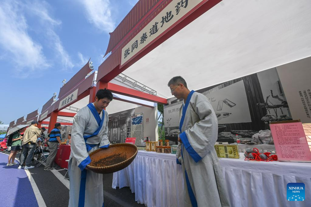 Exhibitors demonstrate the techniques of making traditional Chinese medicine during an activity marking the upcoming Cultural and Natural Heritage Day in Hangzhou, east China's Zhejiang Province, June 9, 2023. A series of activities in celebration of the upcoming Cultural and Natural Heritage Day were held at the Gongshu Canal Sports Park in Hangzhou, showcasing 66 Chinese intangible cultural heritages which are inscribed at UNESCO, national, provincial, municipal or district levels. (Xinhua/Xu Yu)