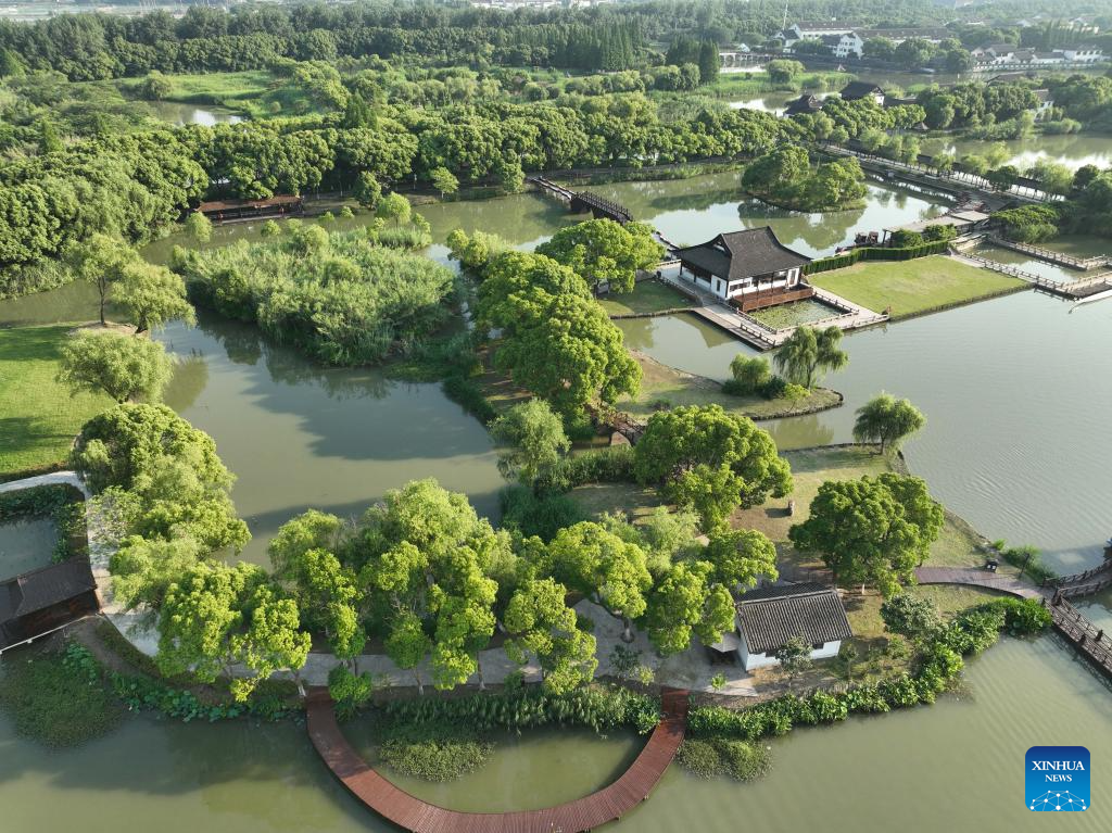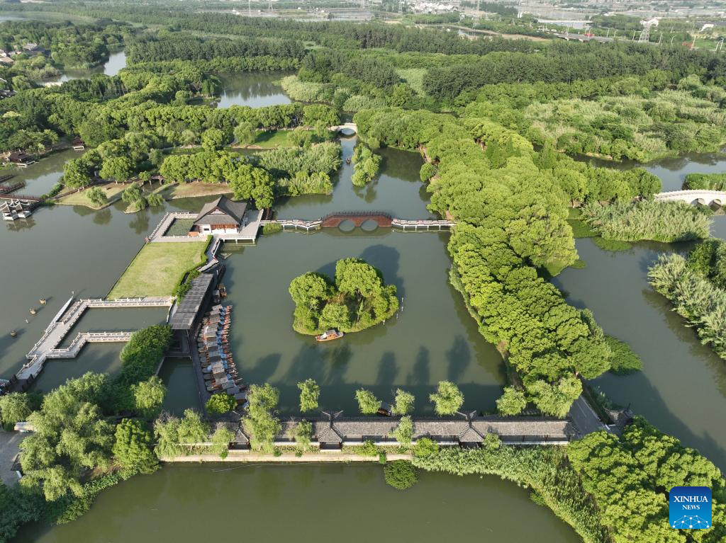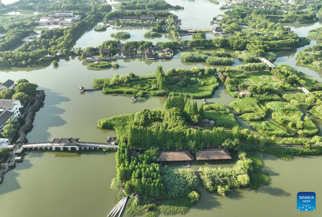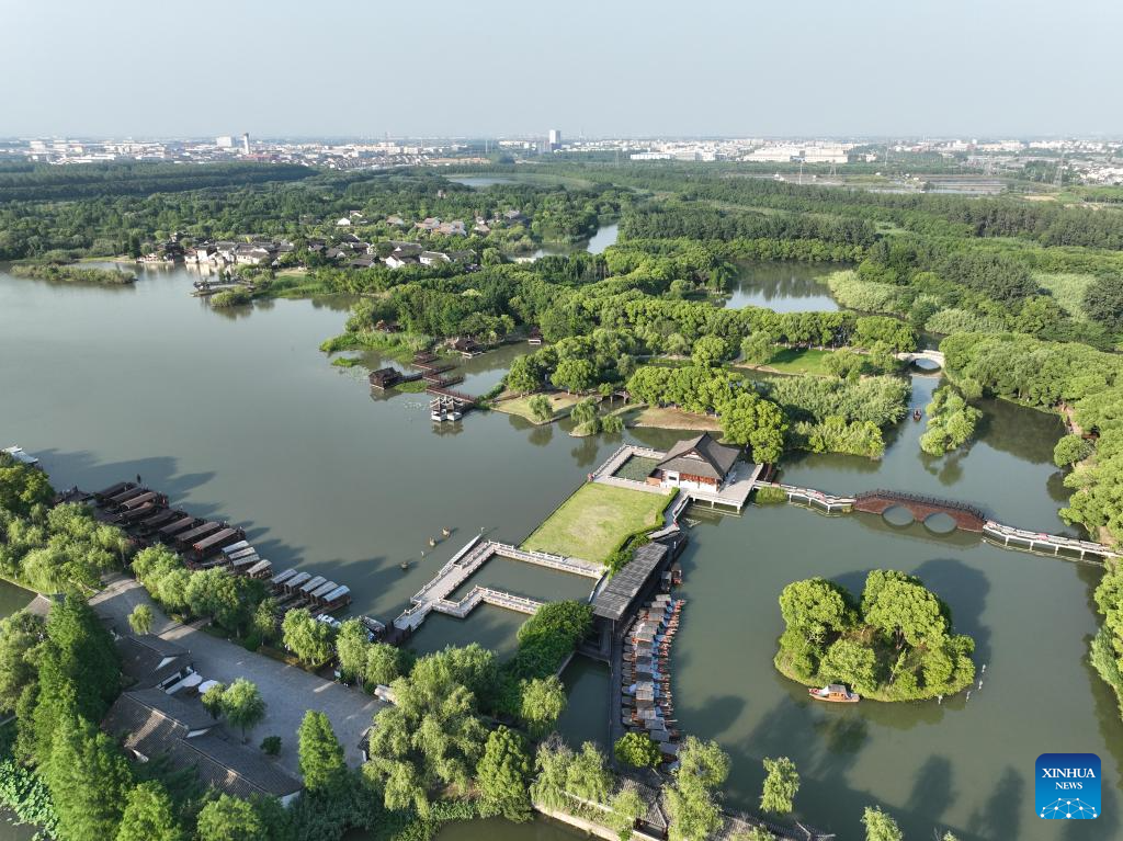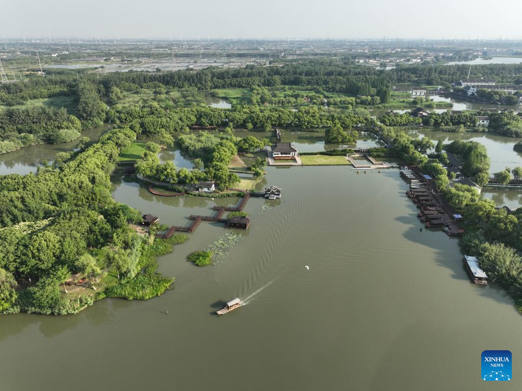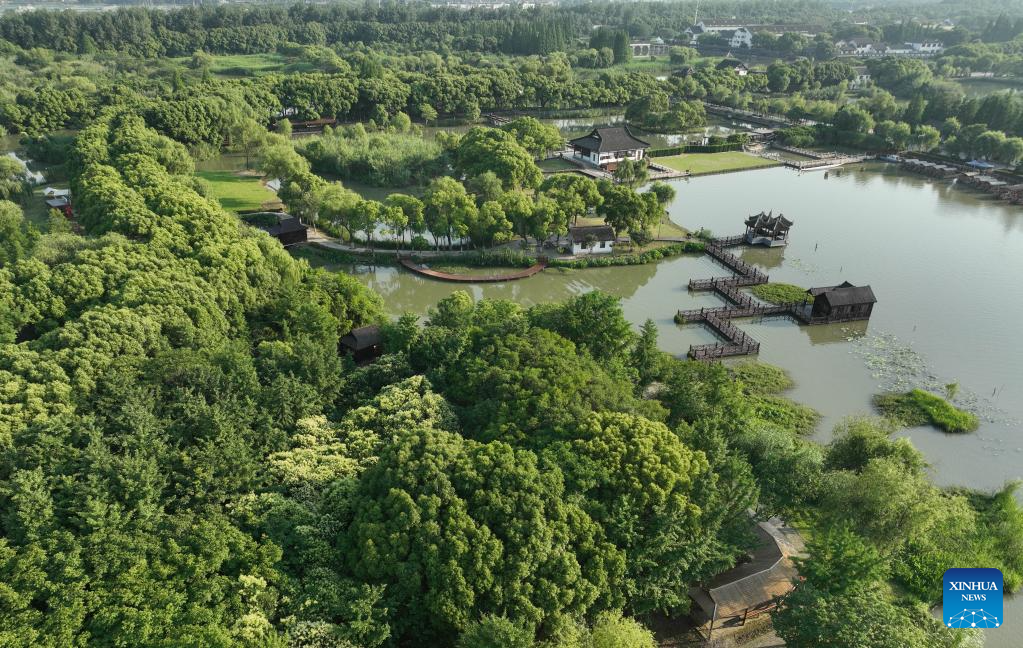 This aerial photo taken on June 9, 2023 shows the scenery of Shajiabang National Wetland Park in Changshu, east China's Jiangsu Province. (Xinhua/Ji Chunpeng)