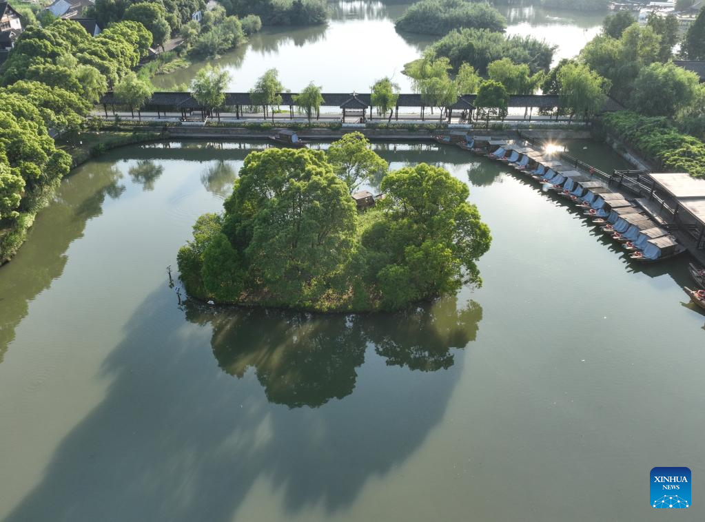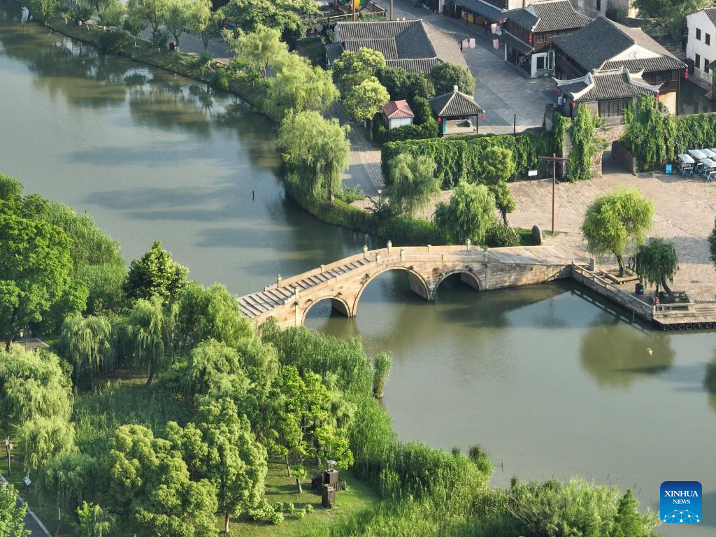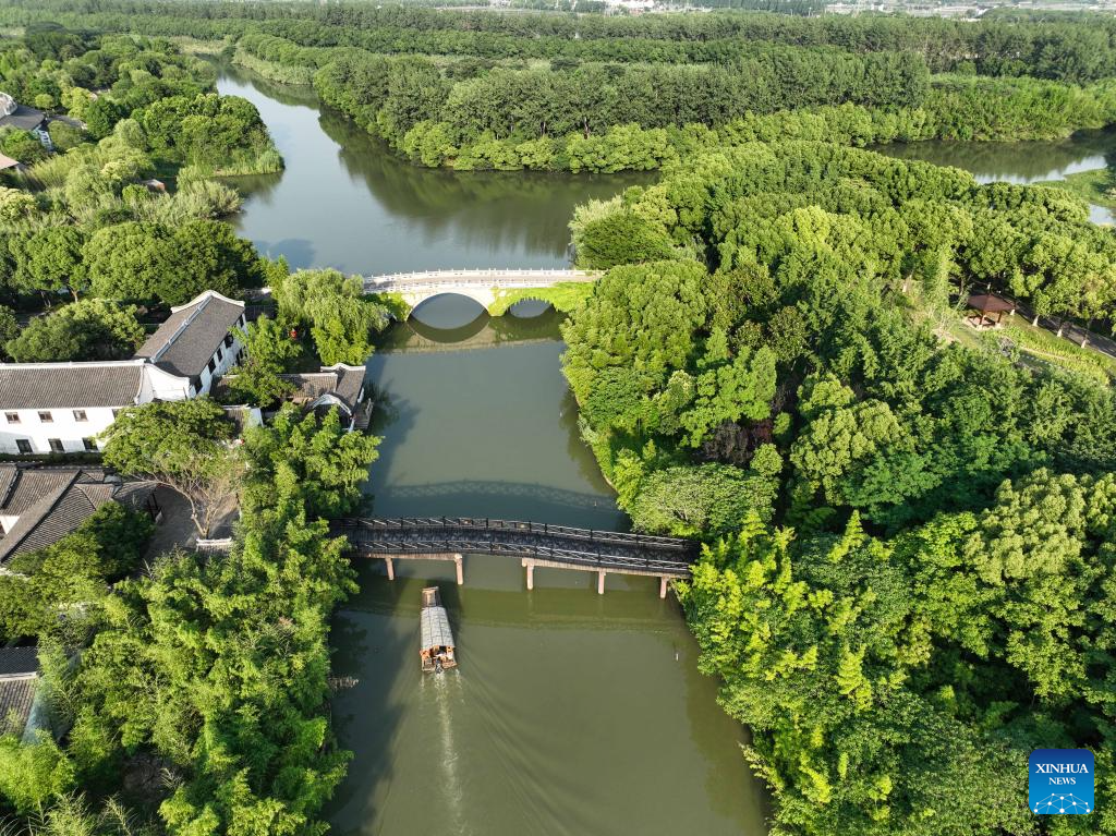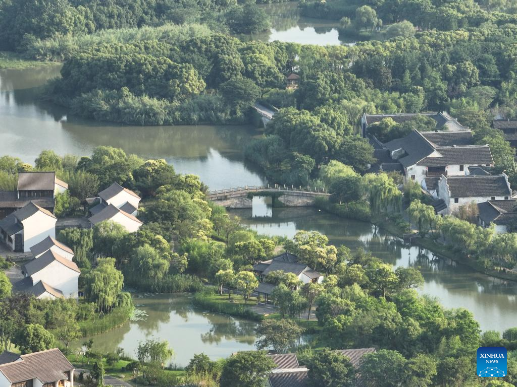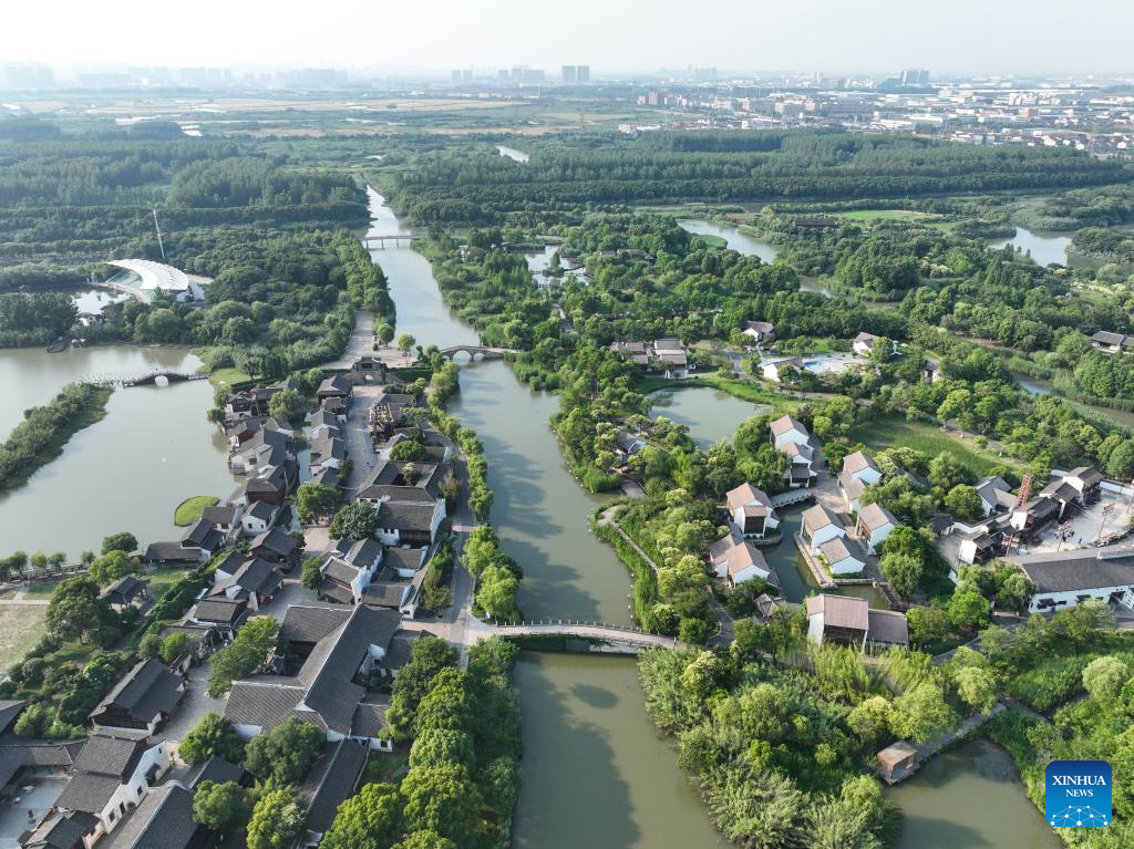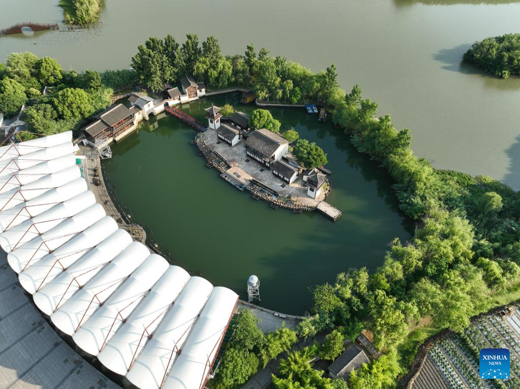 This aerial photo taken on June 9, 2023 shows the scenery of Shajiabang National Wetland Park in Changshu, east China's Jiangsu Province. (Xinhua/Ji Chunpeng)